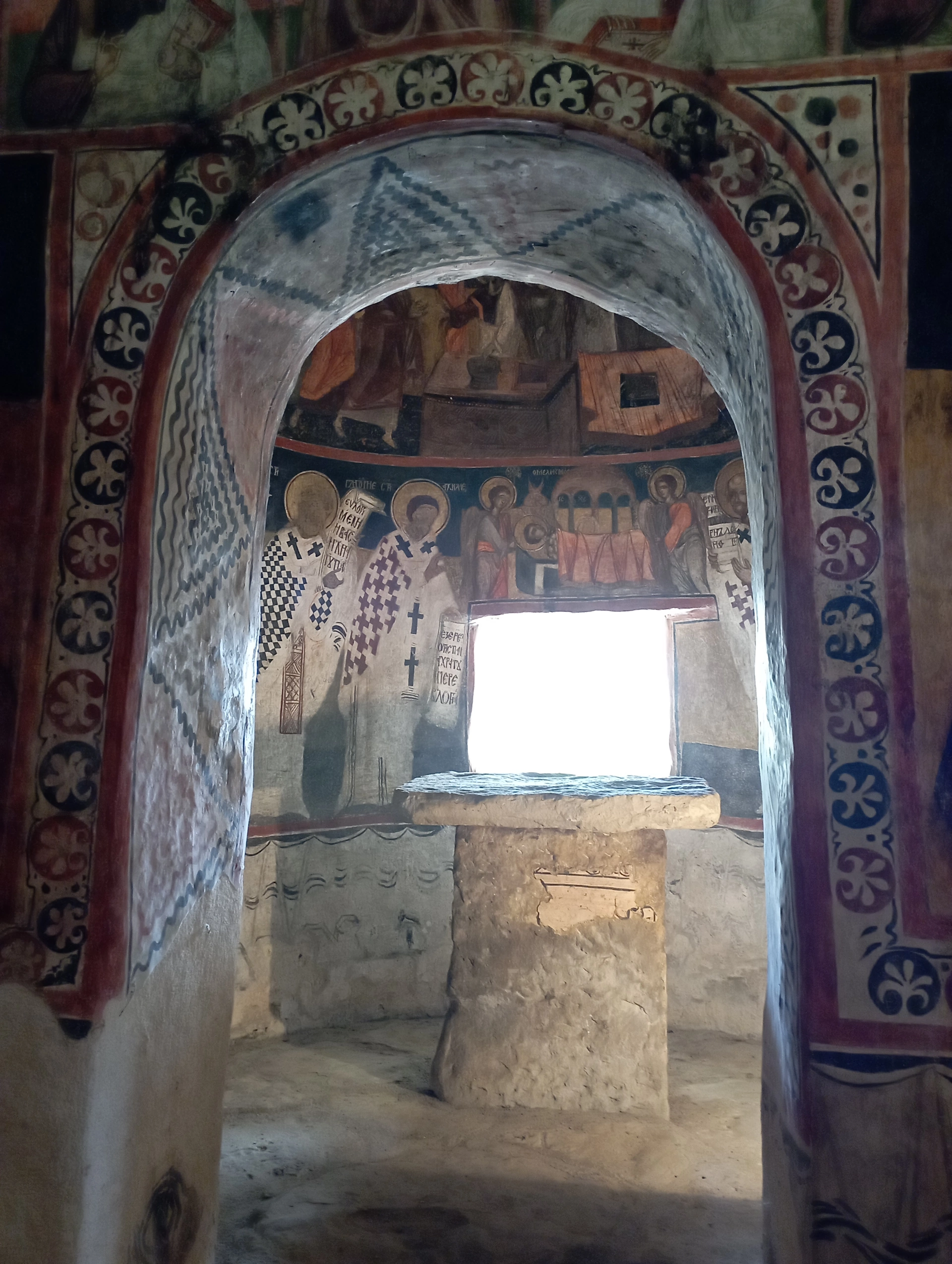 Минавайки през дверите на иконостаса, се влиза в най-свещената част на храма, където е неговият олтар - светия престол. Тук, най-горе, е изобразено Възкресението Христово. Под него, са образите на Богородица и младенеца. А под тях, са сцени от Причестяването на апостолите и Поклонението пред жертвата на Христос. Спорно е датирането на степонисете в църквата. Предполага се, че са рисувани от различни майстори, а може би и в различен времеви период. Надписите на стенописите на иконостаса, сочещи 1715 година, са поставени по-късно, след изографисването му. Това, сочи вероятния краен период, но не и началния... А, да не забравя, ако пожелаете, да посетите този древен храм, за да усетите и видите всичко това, за което ви разказах, първо трябва, да се свържете с кмета на селото, който държи ключа на храма.