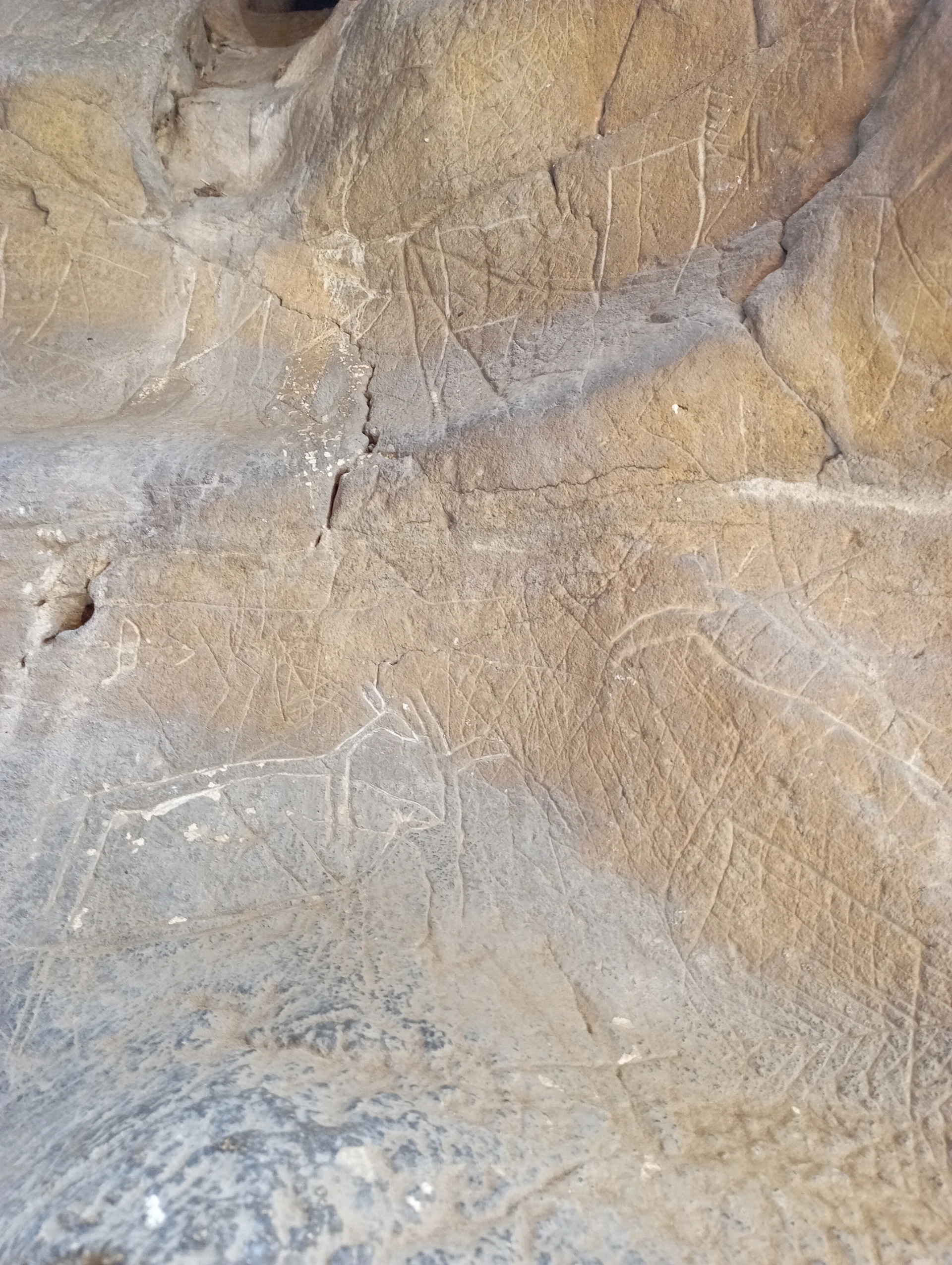Една от най-ясните композиции в пещерата, изобразяваше струпване на сърни и елени. Възможна ловна сцена или част от ритуал, сочещ, че сме пристъпили прага на древно, езическо светилище. В средата на образите, стоеше грубо издълбан кръст. Вероятно, това е направено през средновековието, когато в района е имало скален манастир. Своебразна демонстрация на сила и заличаване значението на свято за старите вярвания място.