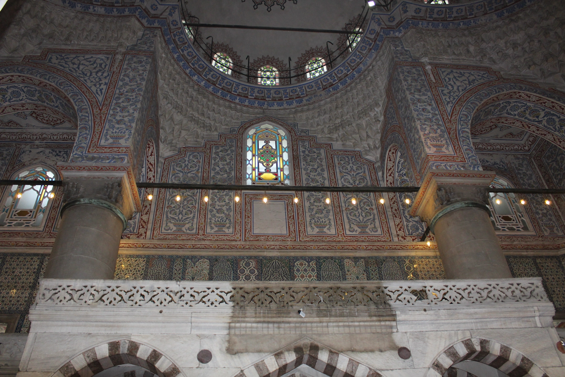 Вътрешните стени на джамията, са облицовани с хиляди керамични плочки, изобразяващи саксии, от които подобно на фонтан, извират цветя. Преобладаващите цветове са червено и най-вече синьо, от където идва и прозвището – Синята джамия.