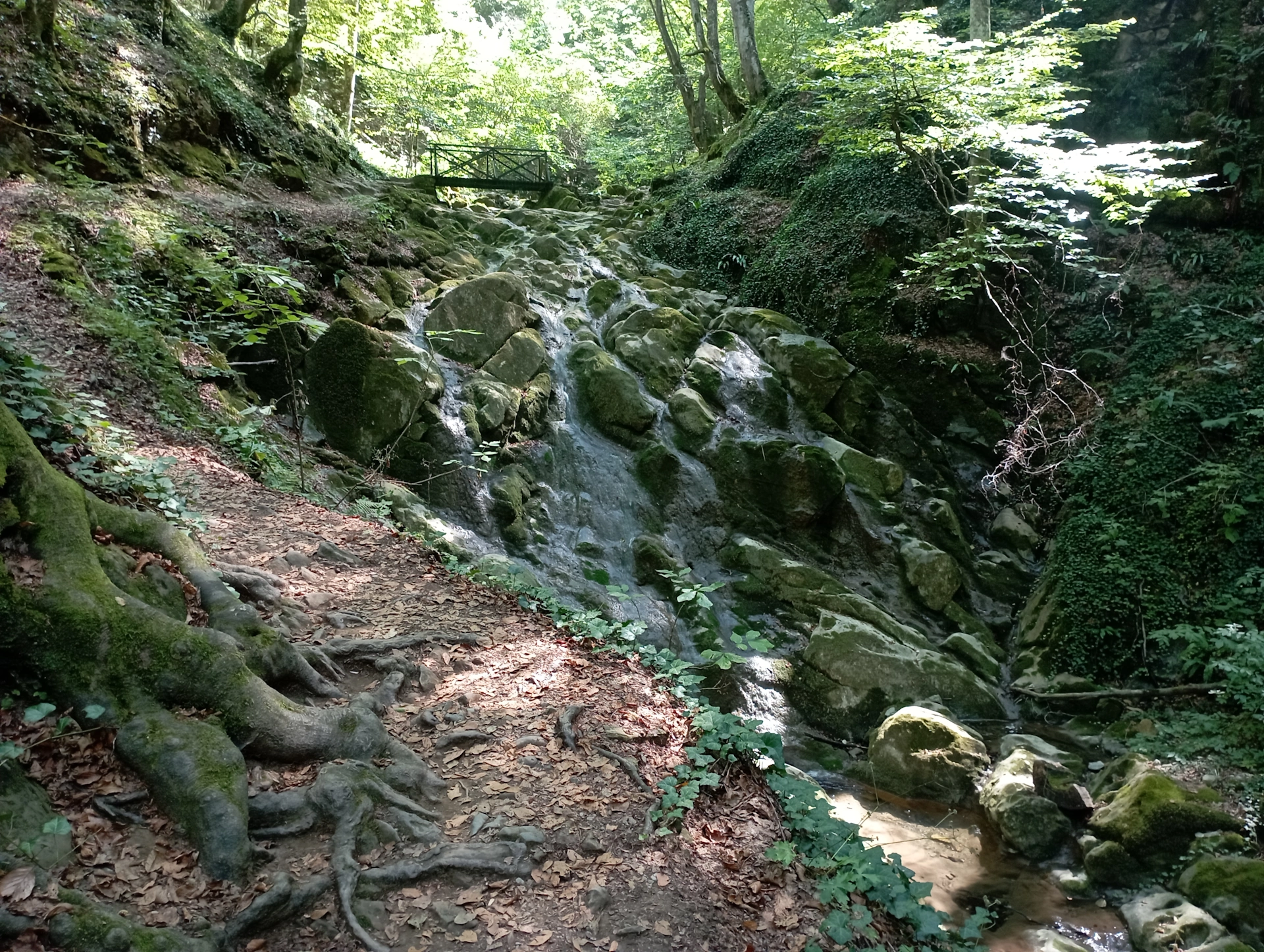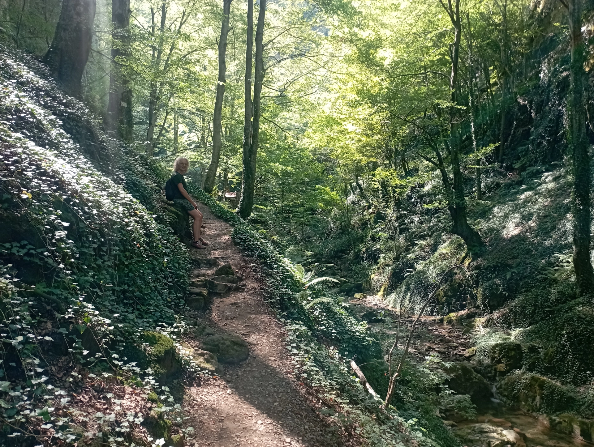 Короните на буките, ни предпазваха от слънцето, задържайки влагата в ниското и създавайки усещане за прохлада. Всичко наоколо, бе покрито с килим от зеленина. По склоновете се спускаха гирлянди от пълзящи растения. Скалите, големите и малките камъни, разпръснати в реката, бяха превзети от стелещия се наоколо ярко зелен мъх.
