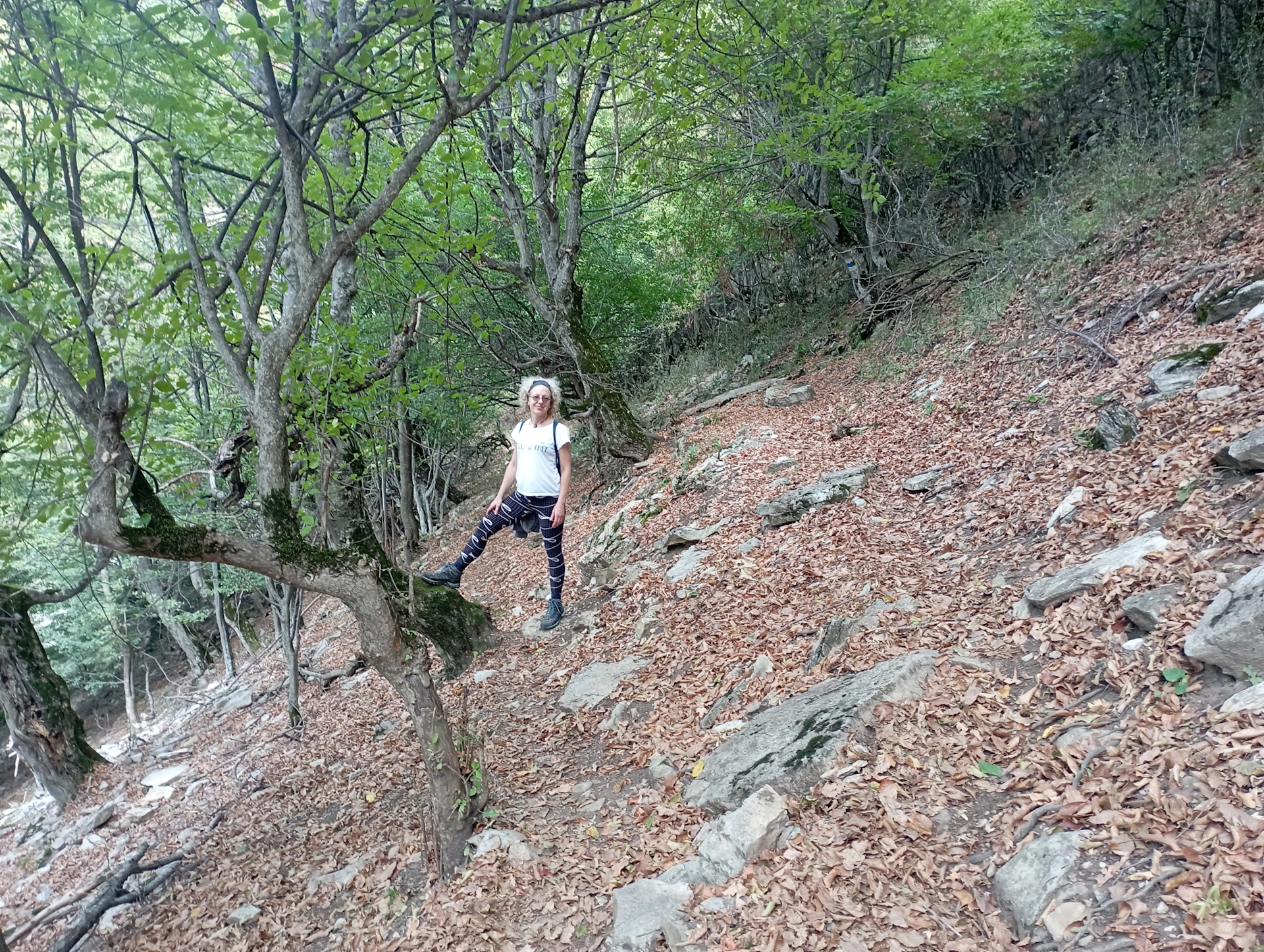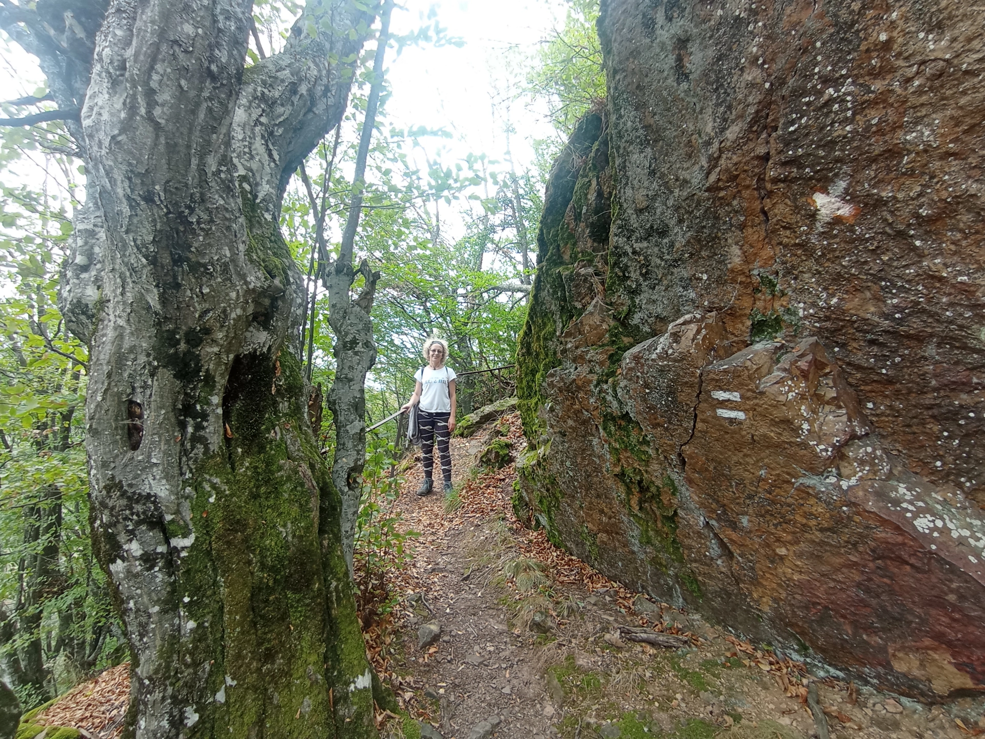 Навлязохме в гората след седловината и започнахме изкачването към платото. Местността е скалиста, с твърда, червеникава почва, покрита с мрежа от корени на израсналите тук буки. Между разпръснатите по склона дървета, проникваха слънчеви лъчи, създавайки килим от тъмни и светли участъци. Всичко това, пробуди в мен усещане за леко мистична атмосфера. Сякаш почуствах аурата на това място – силна и чиста. Тя ме приканваше да спра, поседна и се полюбувам на момента и заобикалящата ме красота.