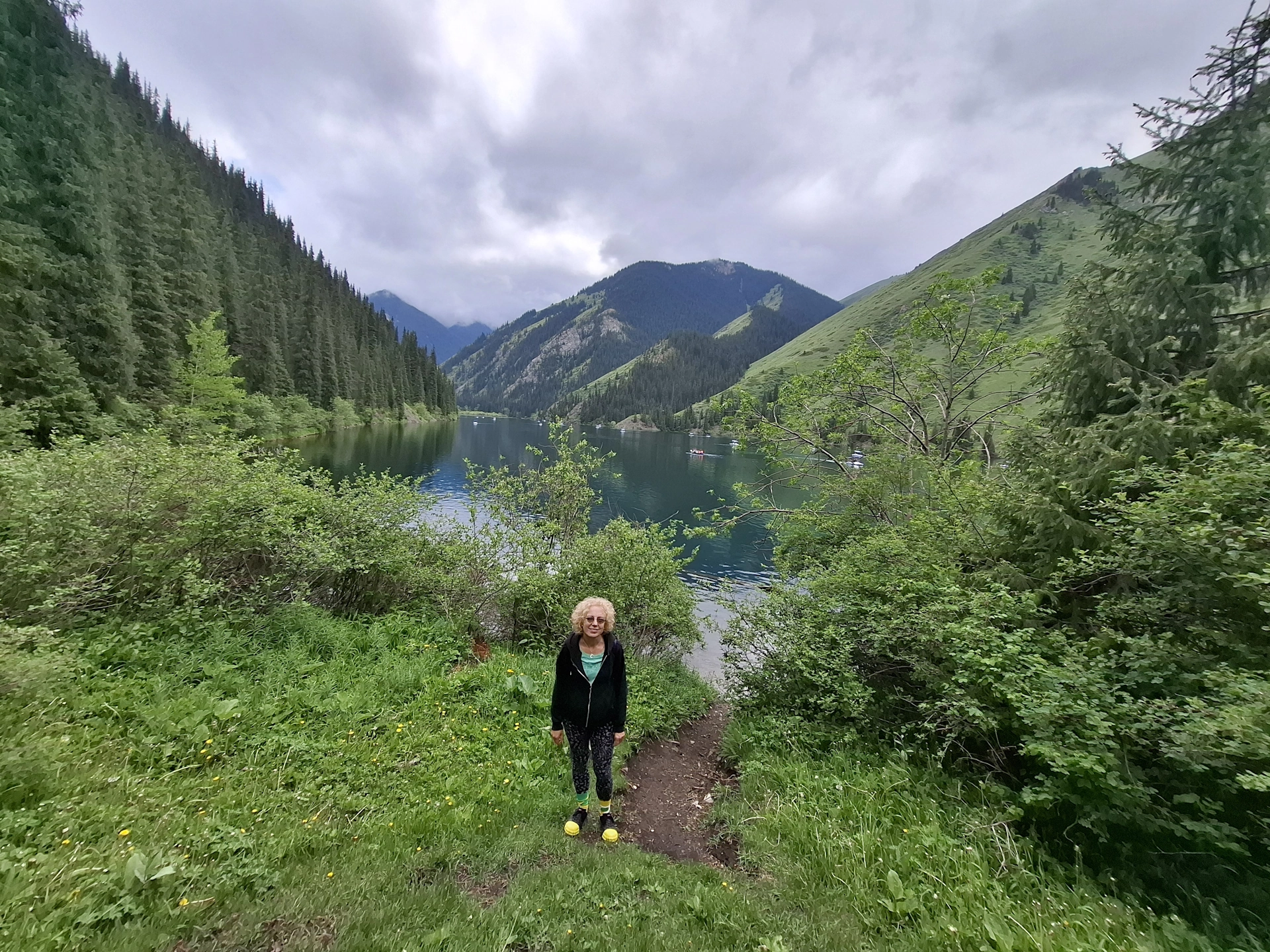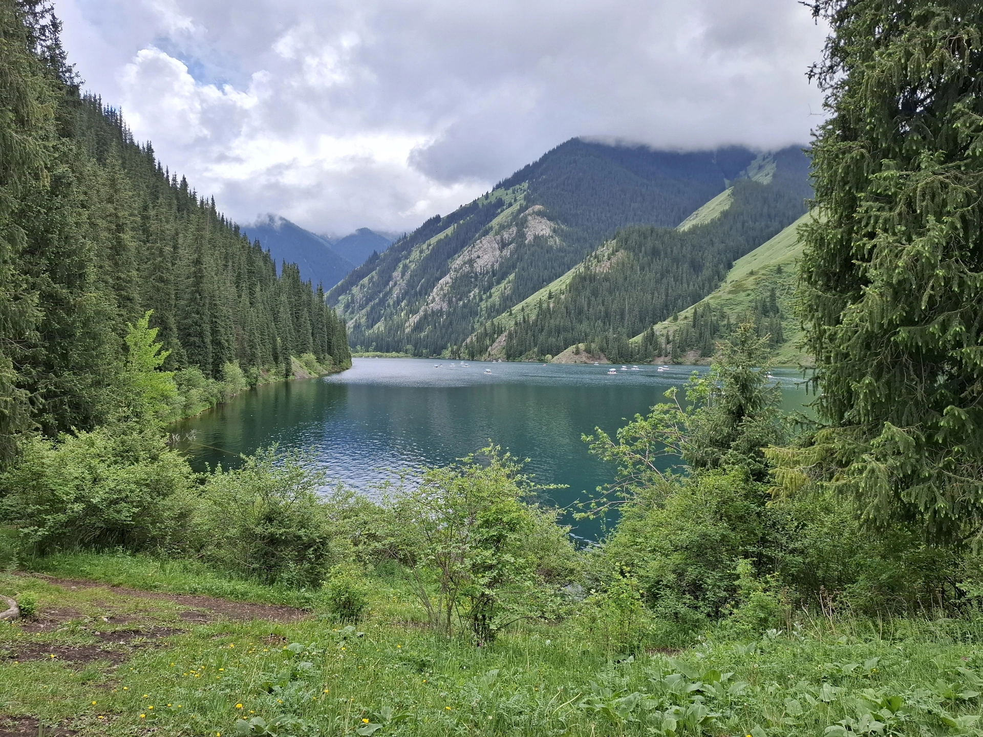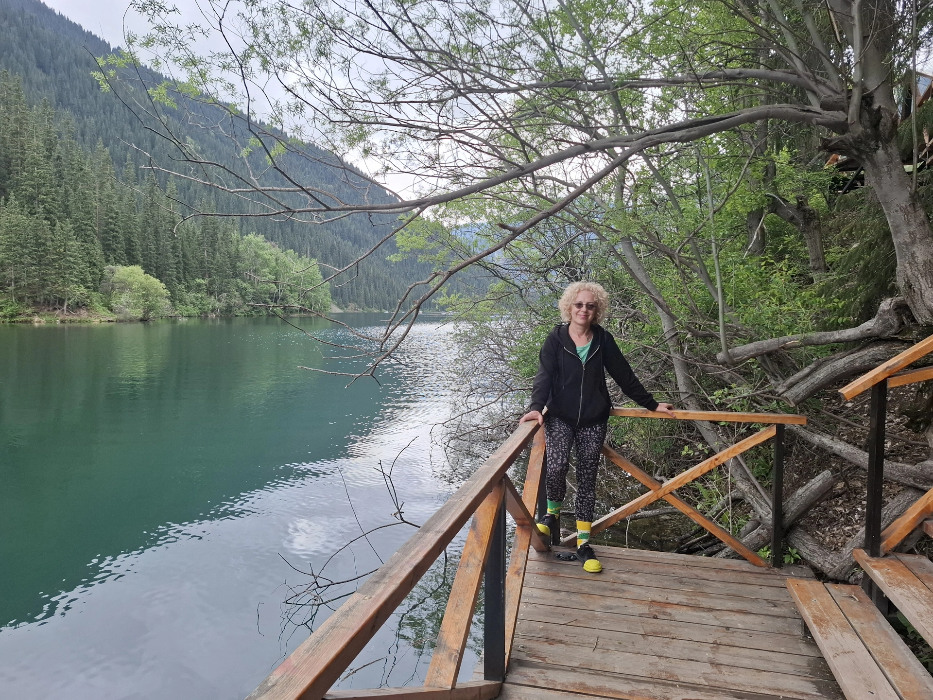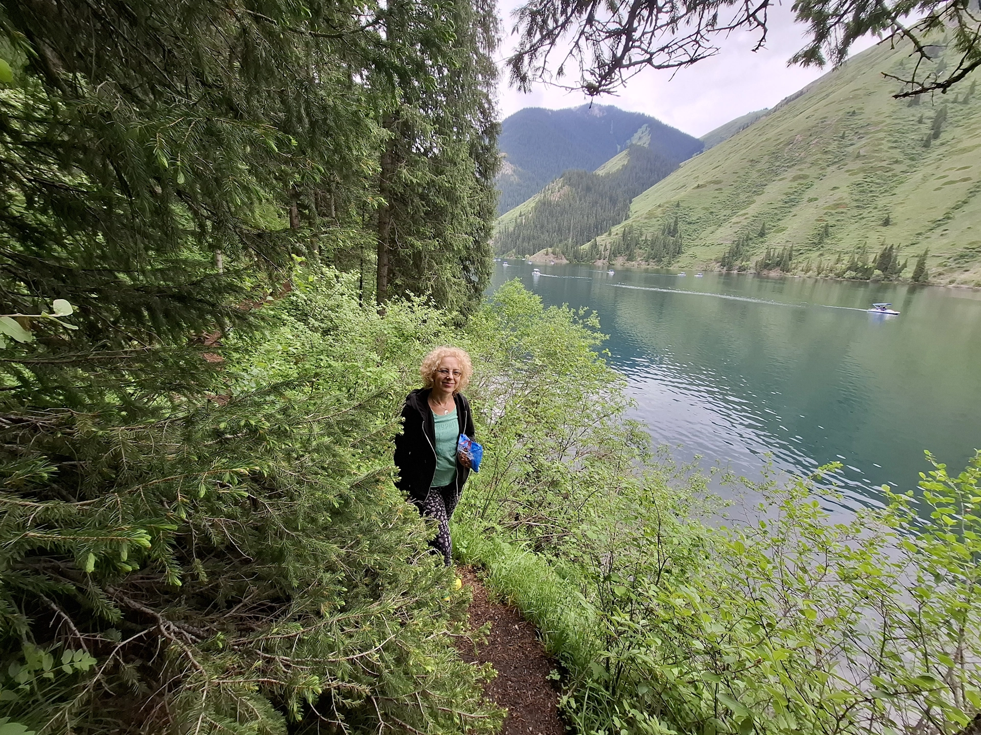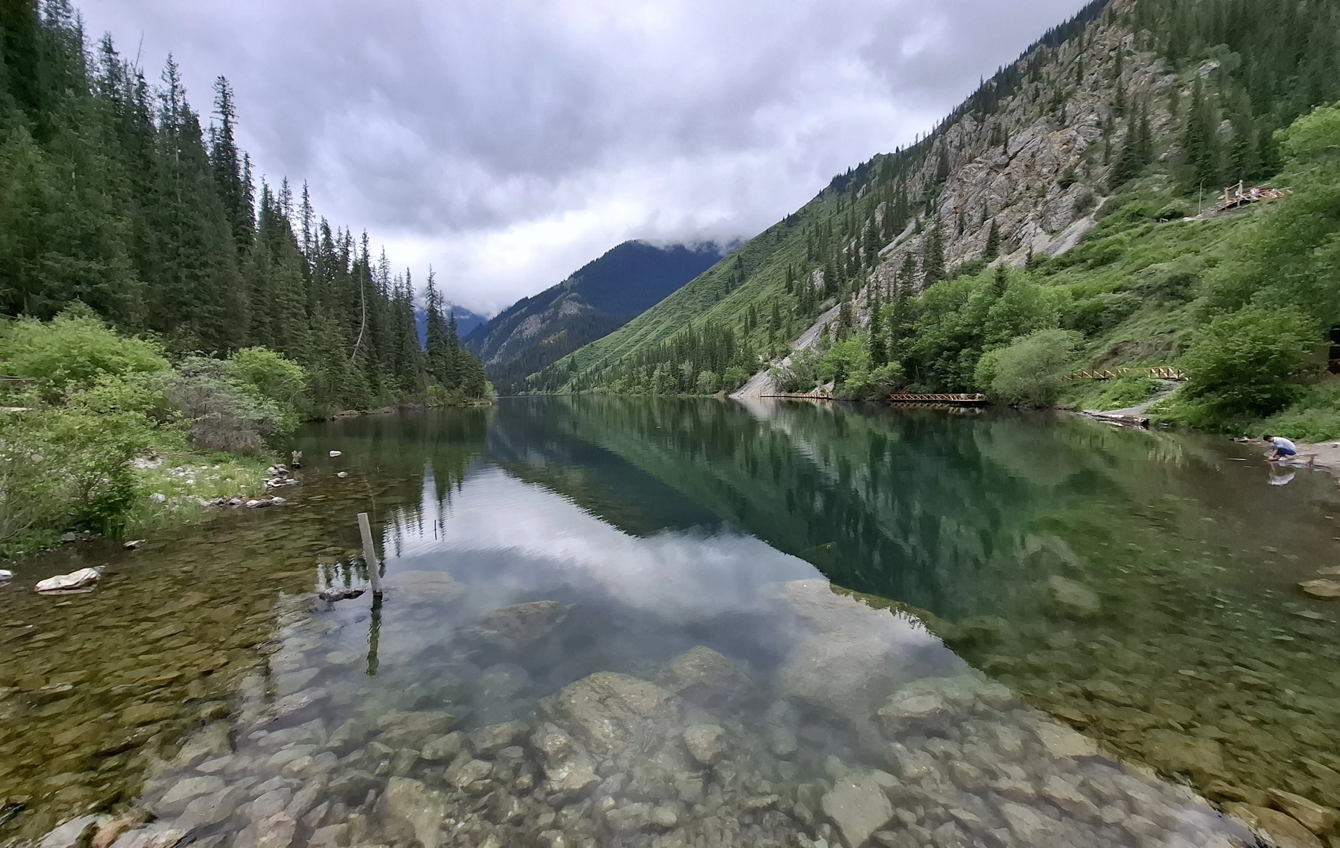 Пред нас, се простираше равната като тава, кристално искряща повърхност на езерото, обградена от оглеждащи се в нея, стръмно спускащи се брегове. На места, те представляваха просто сиви скали, но в по-голямата си част, бреговете бяха обрасли в зеленина и високи смърчове, създавайки едно наистина красиво кътче в скута на планината. Не случайно, Национален парк Колсайски езера е биосферен резерват на Юнеско, наричан „Казахстанска Швейцария“.