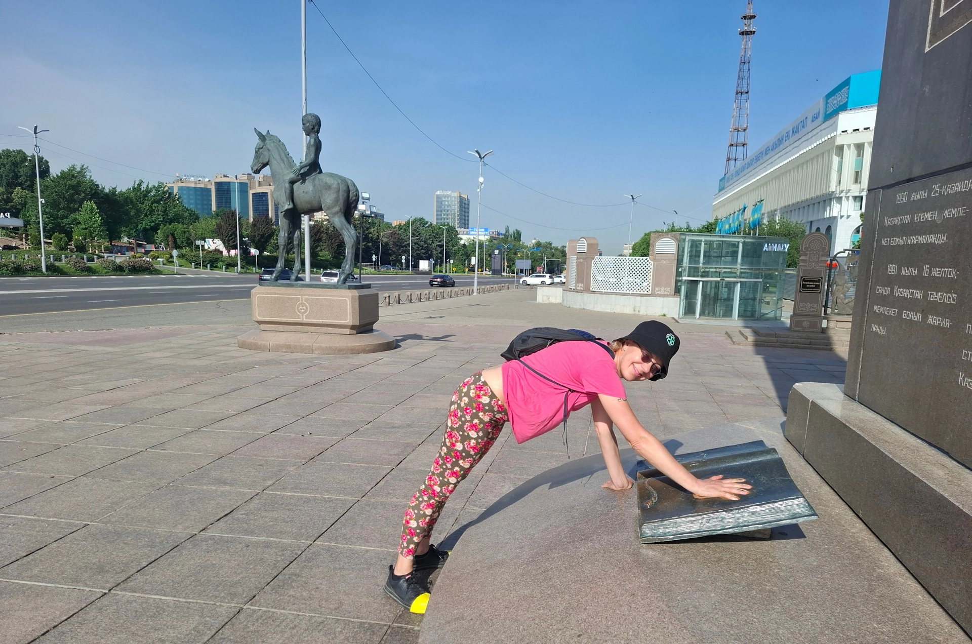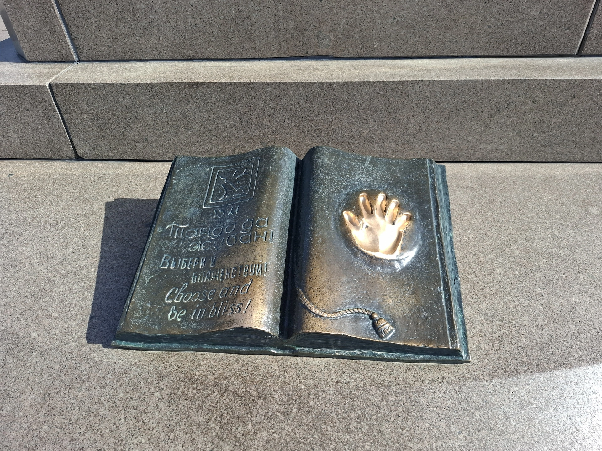В основата на колоната е монтирана разтворена книга, с отпечатък от ръката на президента на Казахстан.