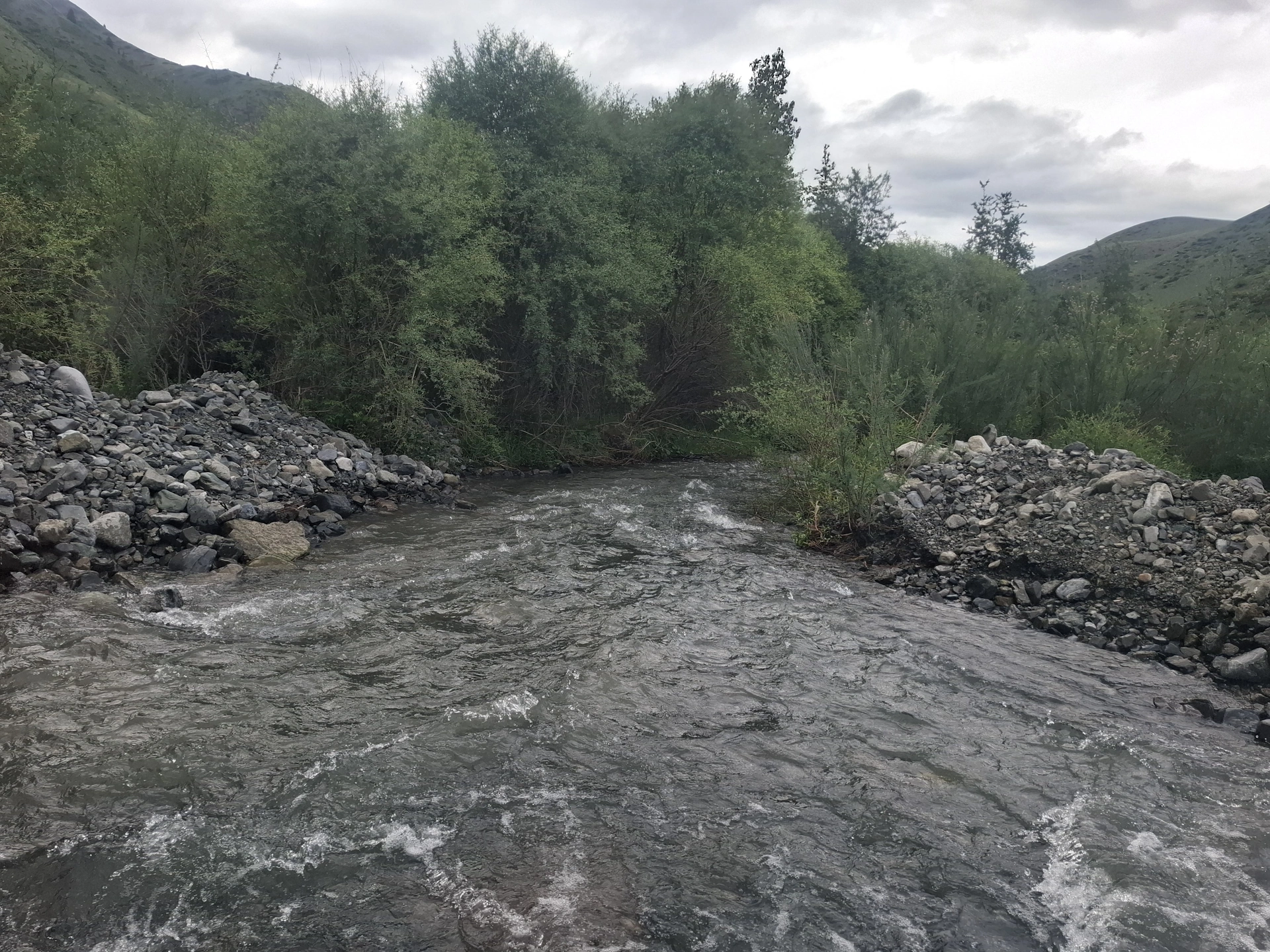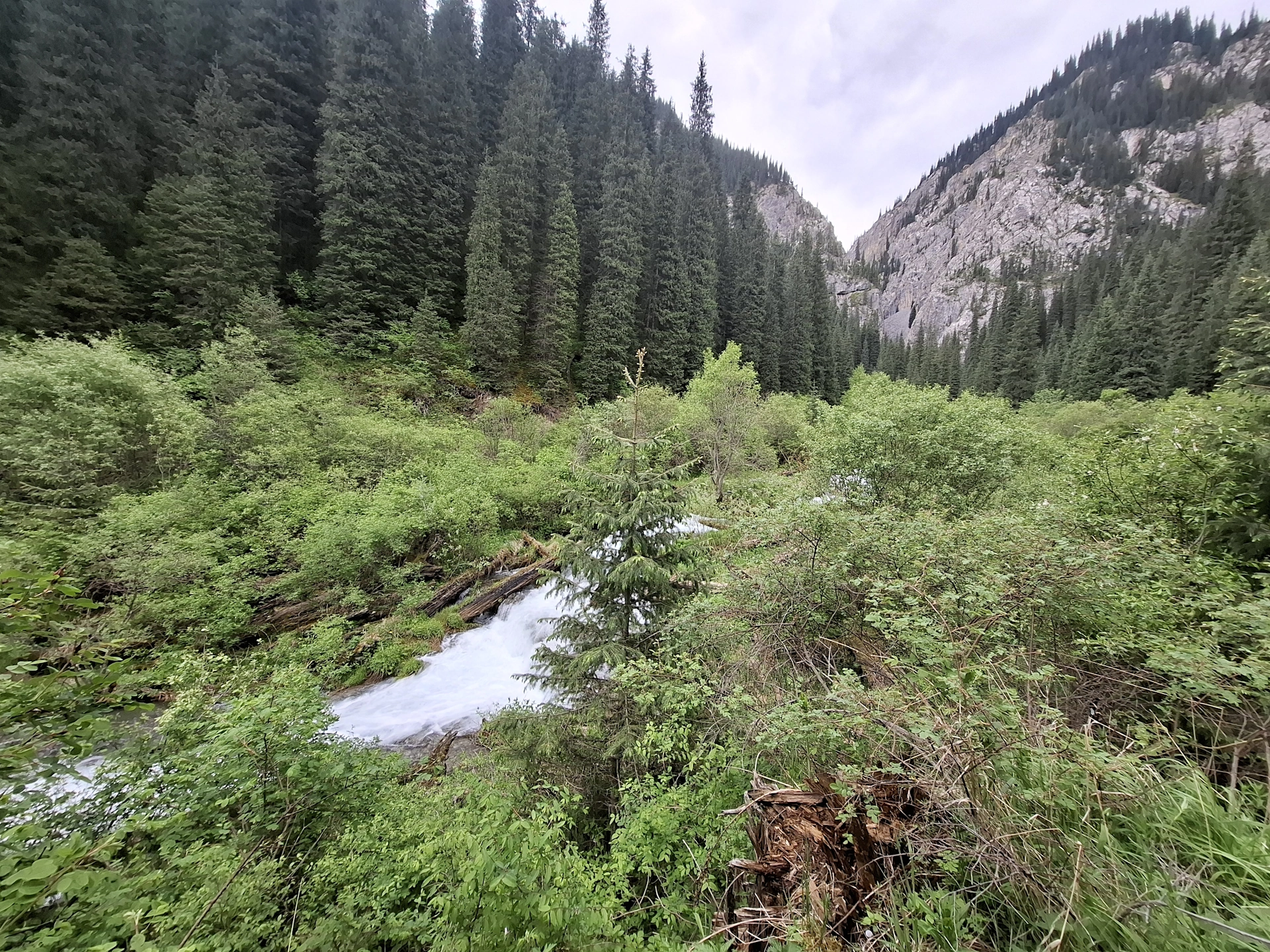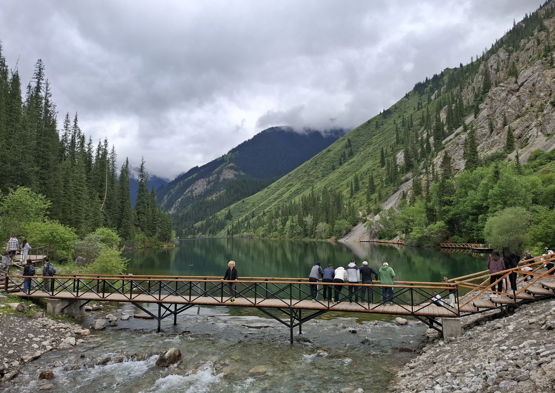 Пътеката надолу, ни изведе в единия край на езерото, точно там, където от него се оттича река Колсай. Над нея, е изграден дървен мост, по който се прехвърлихме на отсрещния ѝ бряг.