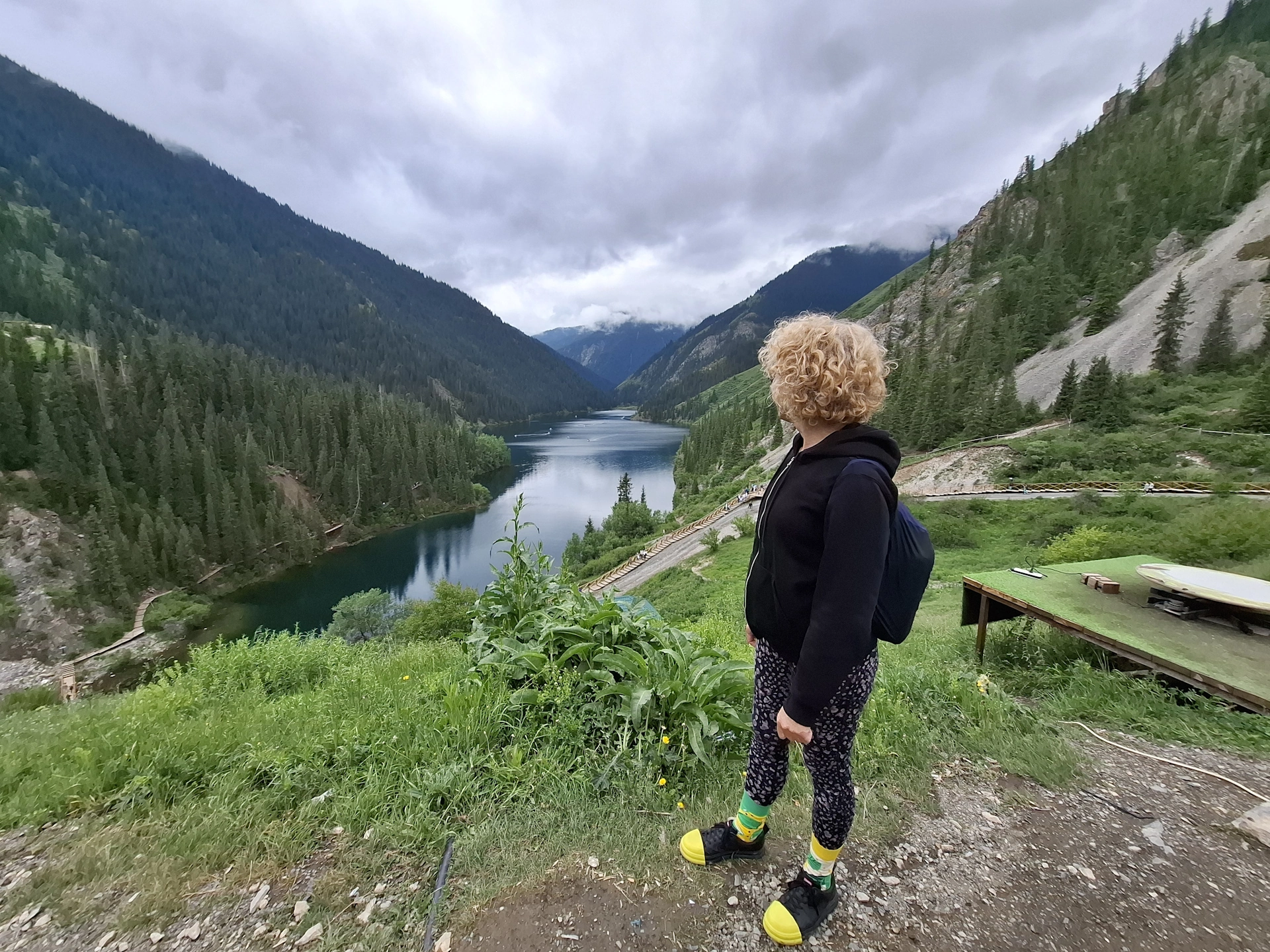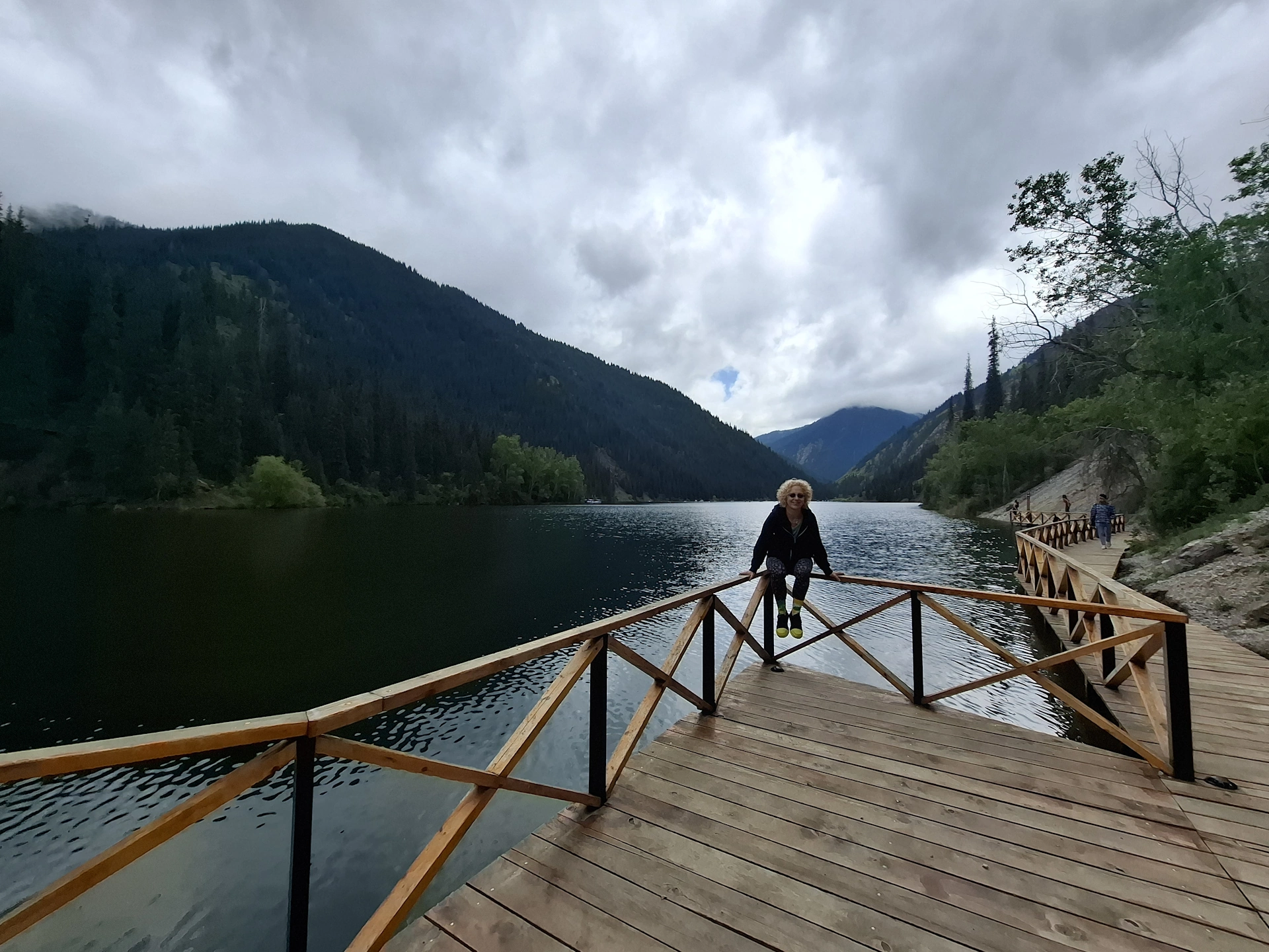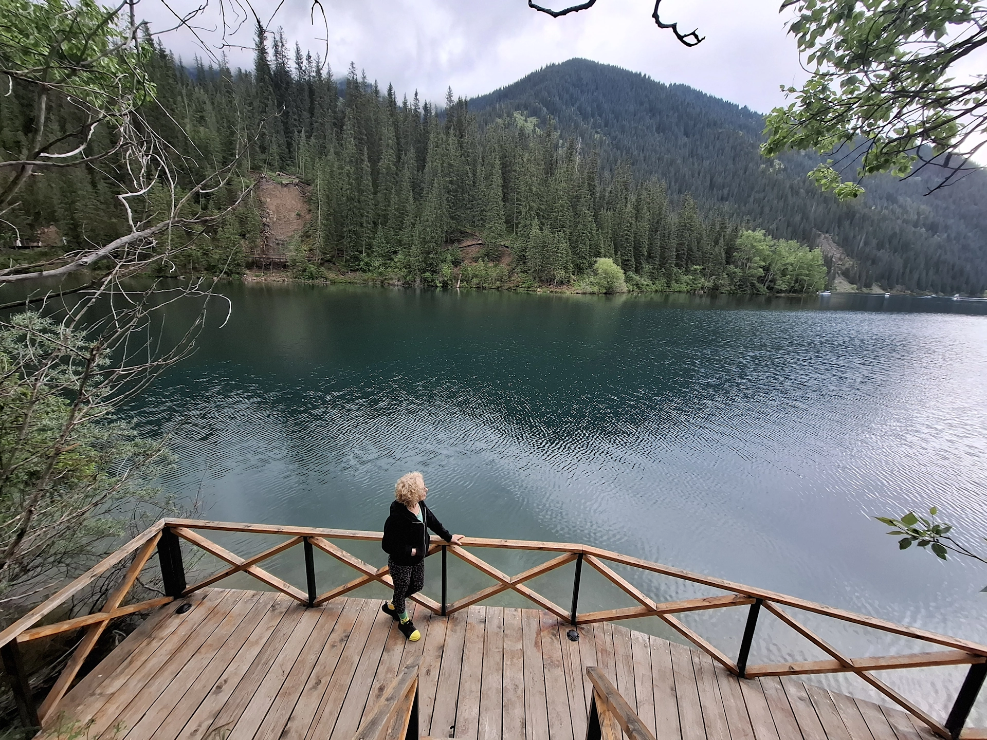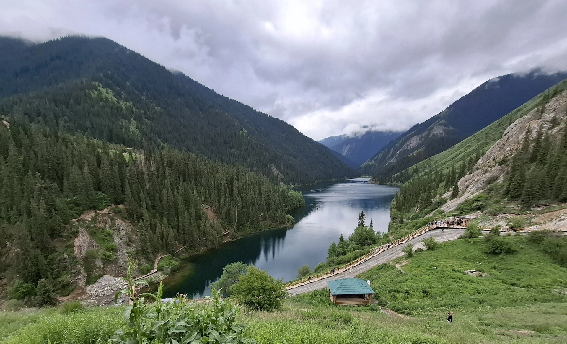 Водачът ни, взе правилното решение, вместо да чакаме неопределено време транспорта си, да продължим до следващата ни цел за деня, а на връщане, да посетим Каинди. Така, след още 16 км. изкачване в планината, достигнахме парковата площадка над Долното Колсайско езеро. От нея, до него, ни оставаха около 400 м. спускане пеша. Небето отново се беше смрачило и буквално миришеше на дъжд, но чистият въздух и красотата на планината, поддържаха приповдигнато настроението ни.