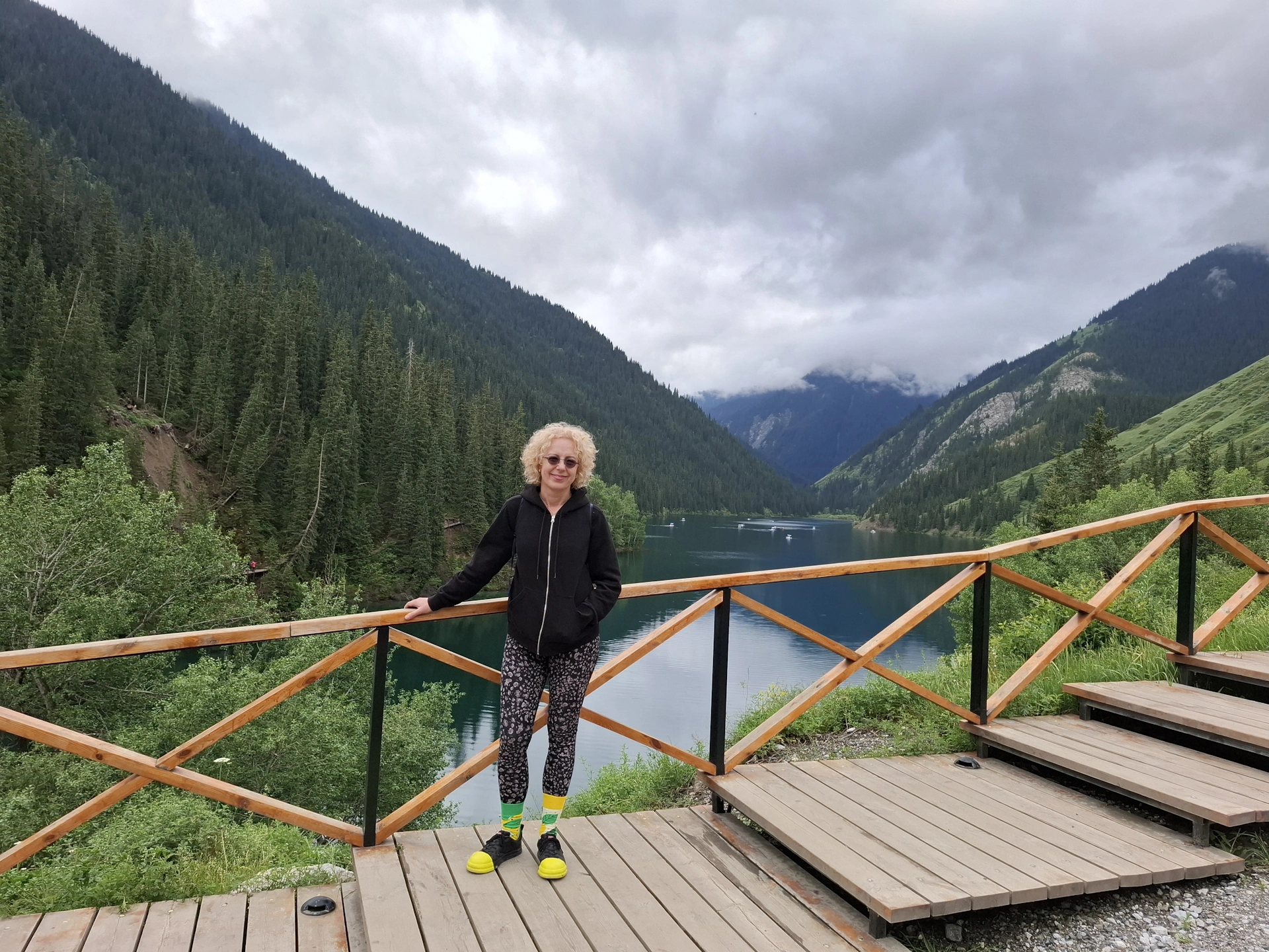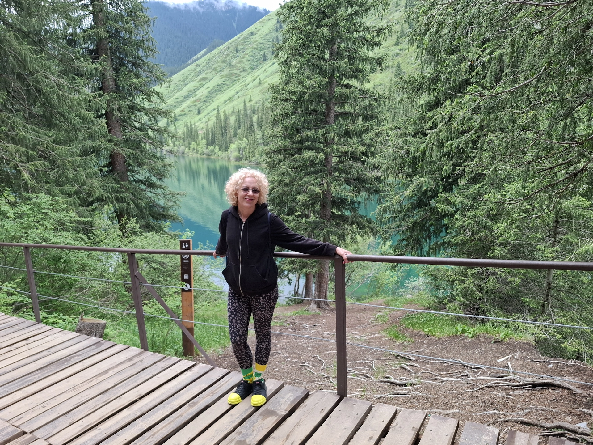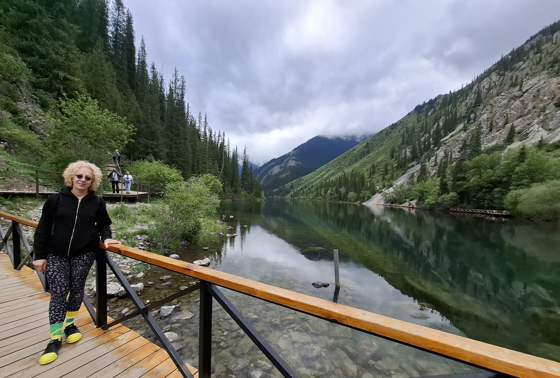 Водачът ни, взе правилното решение, вместо да чакаме неопределено време транспорта си, да продължим до следващата ни цел за деня, а на връщане, да посетим Каинди. Така, след още 16 км. изкачване в планината, достигнахме парковата площадка над Долното Колсайско езеро. От нея, до него, ни оставаха около 400 м. спускане пеша. Небето отново се беше смрачило и буквално миришеше на дъжд, но чистият въздух и красотата на планината, поддържаха приповдигнато настроението ни.