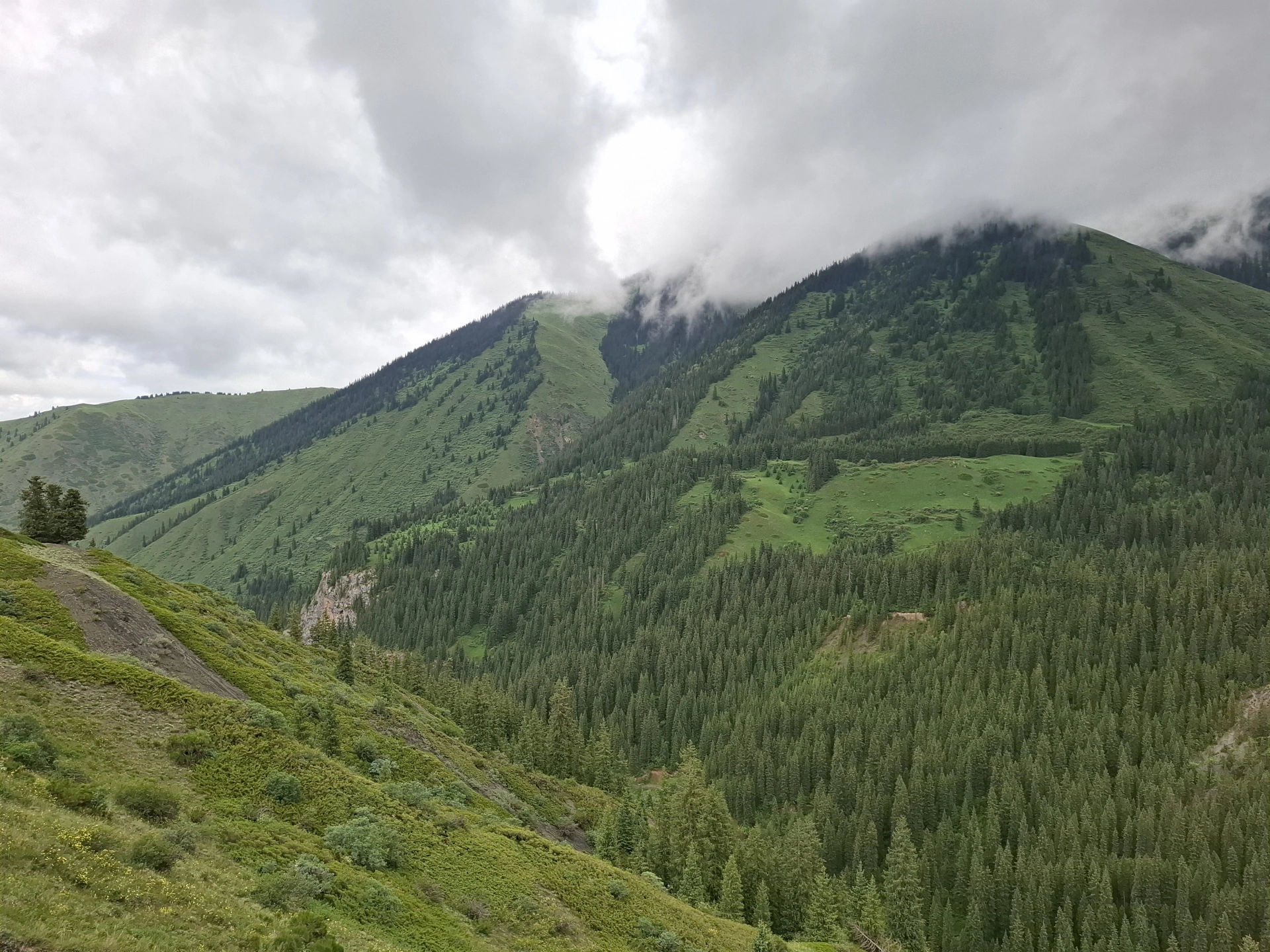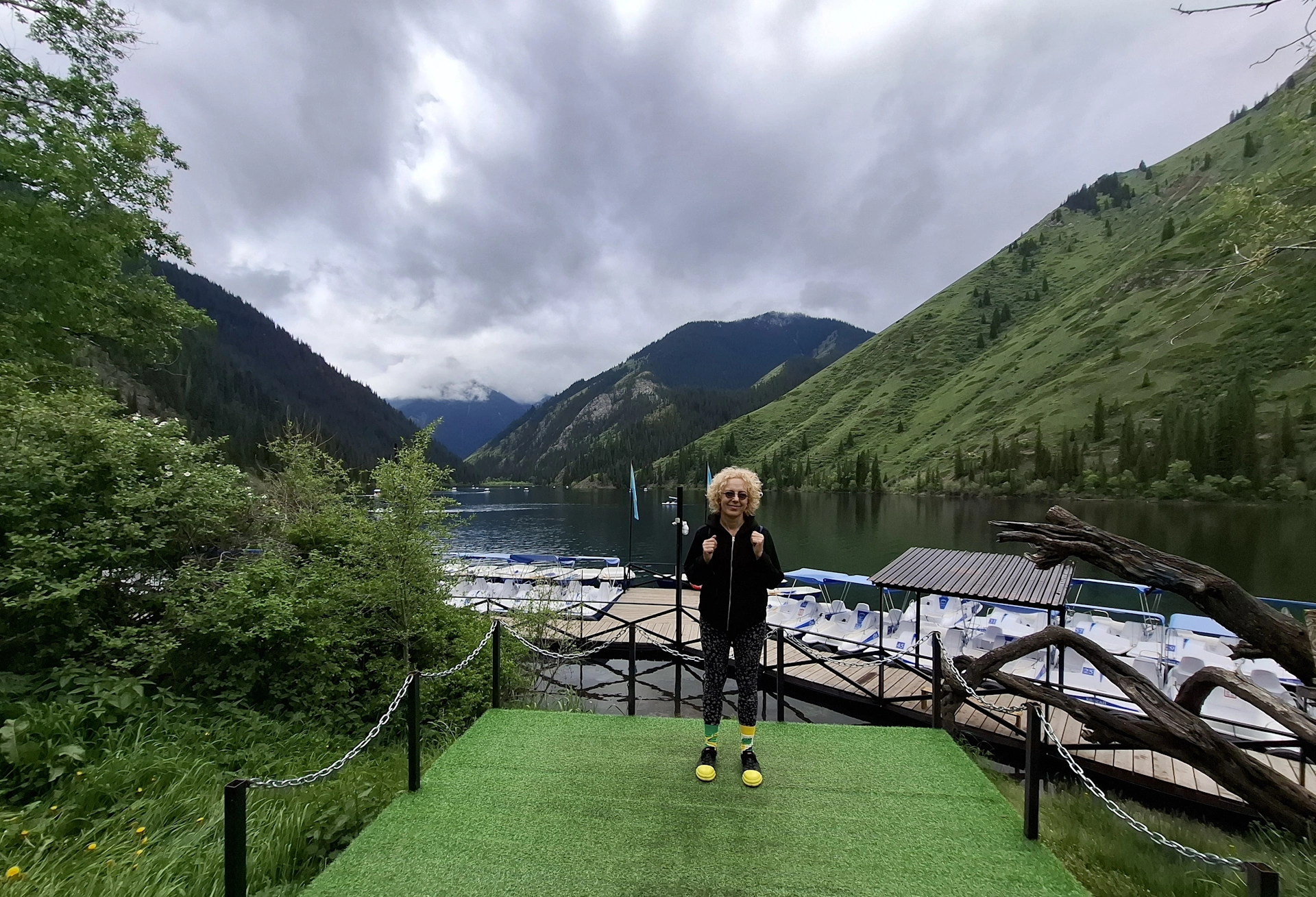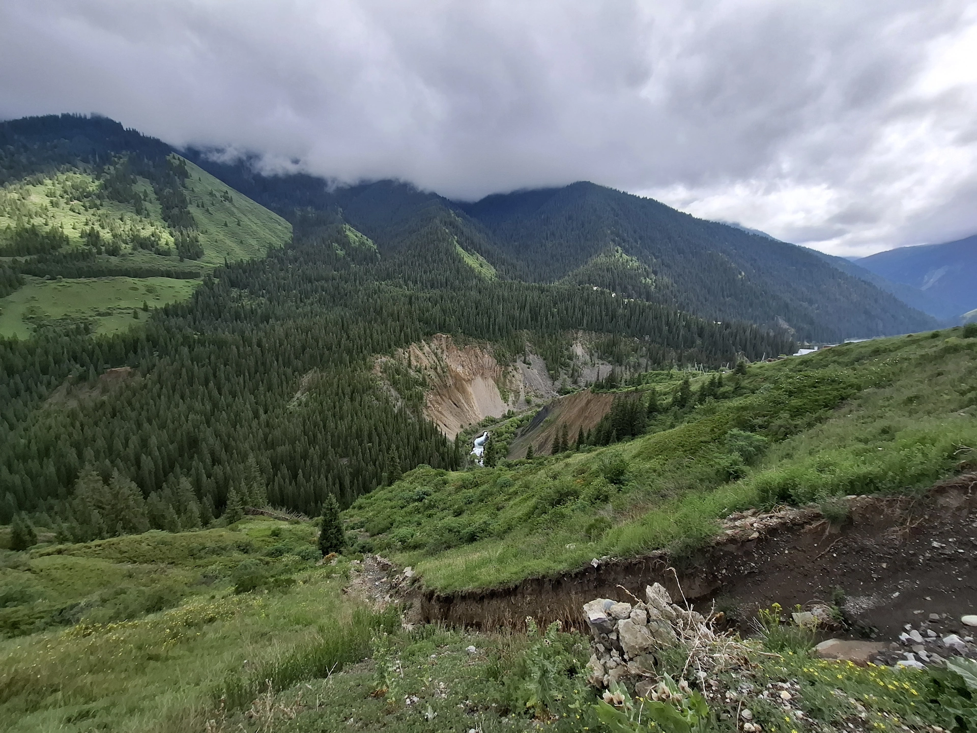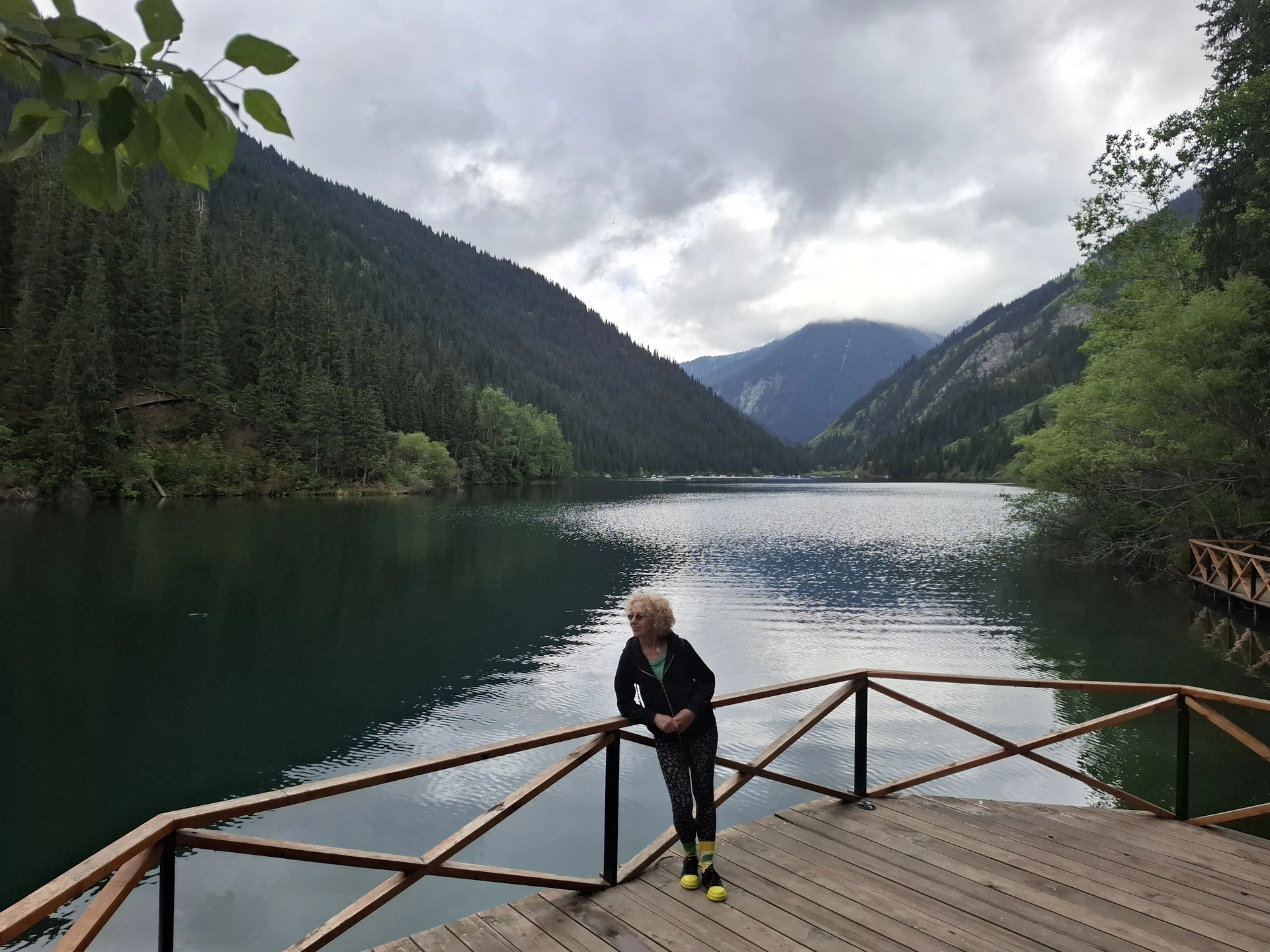 Водачът ни, взе правилното решение, вместо да чакаме неопределено време транспорта си, да продължим до следващата ни цел за деня, а на връщане, да посетим Каинди. Така, след още 16 км. изкачване в планината, достигнахме парковата площадка над Долното Колсайско езеро. От нея, до него, ни оставаха около 400 м. спускане пеша. Небето отново се беше смрачило и буквално миришеше на дъжд, но чистият въздух и красотата на планината, поддържаха приповдигнато настроението ни.