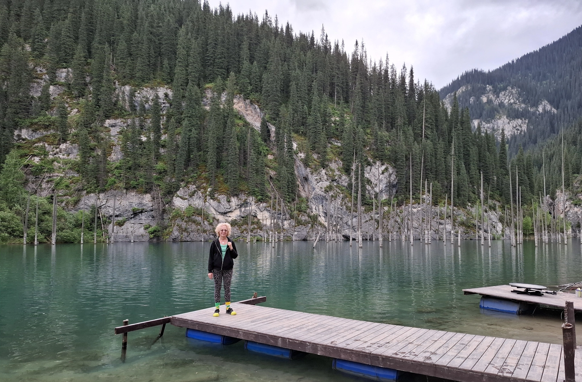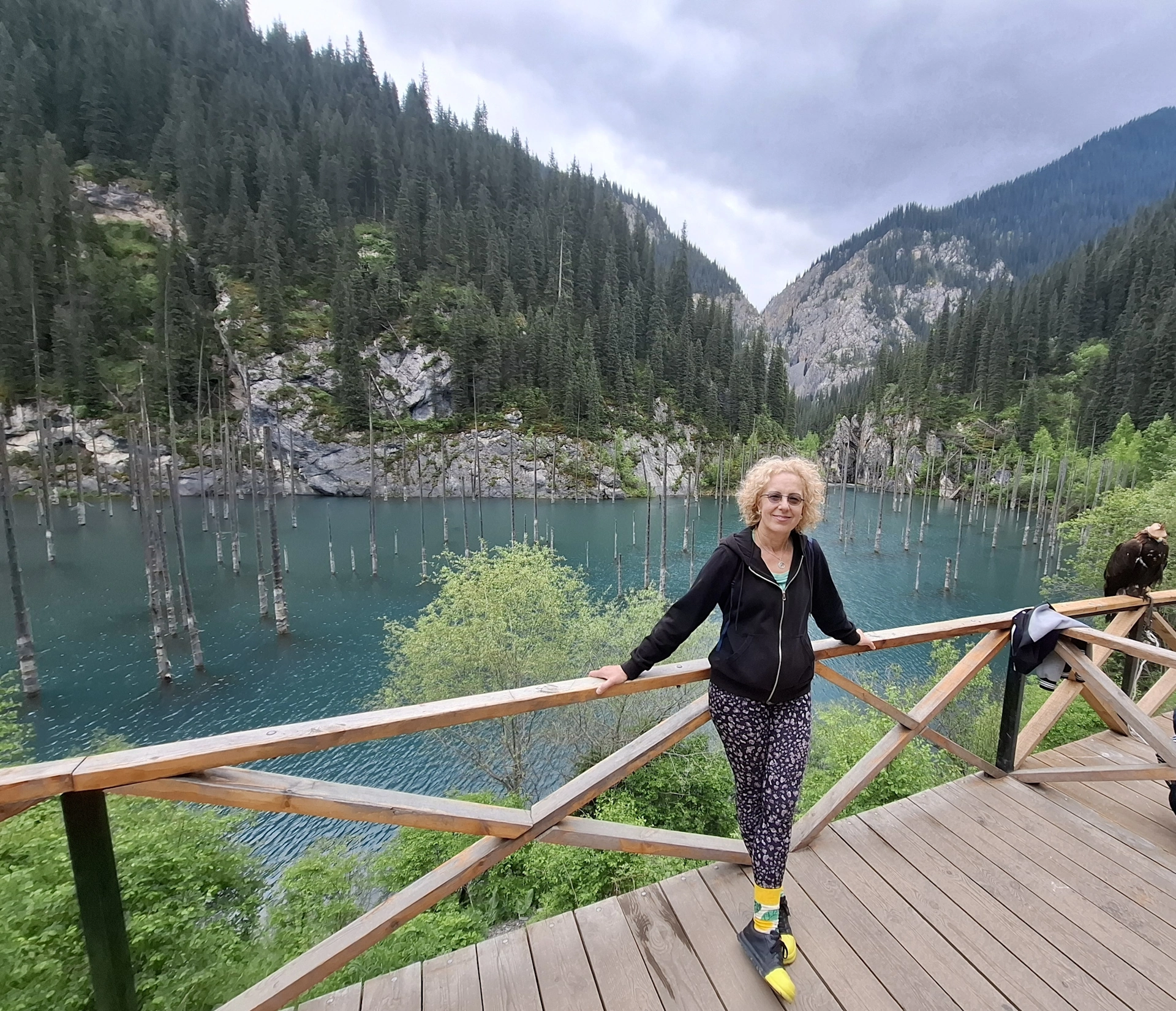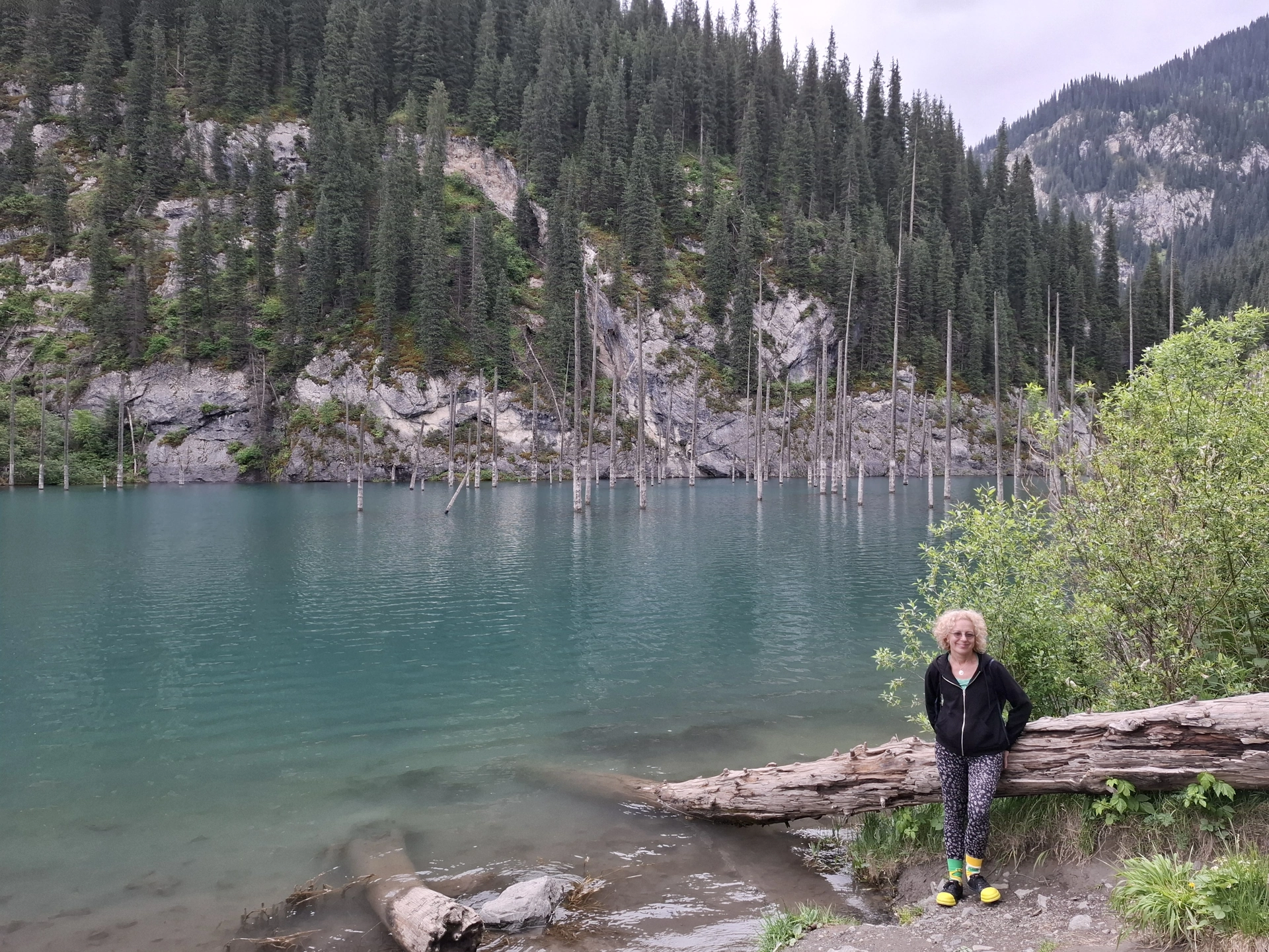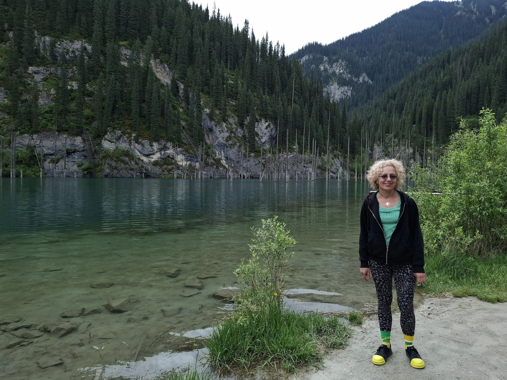 Пред нас се извисяваше планината, с накацали по стръмните ѝ склоновете зелени смърчове. А под нас, езерото искреше в синьозелени багри. От него изплуваха, като заострени копия, стволовете на потъналите дървета. Прекрасна, завладяваща картина, която събуди в мен усещане за нещо мистично, витаещо около нас.