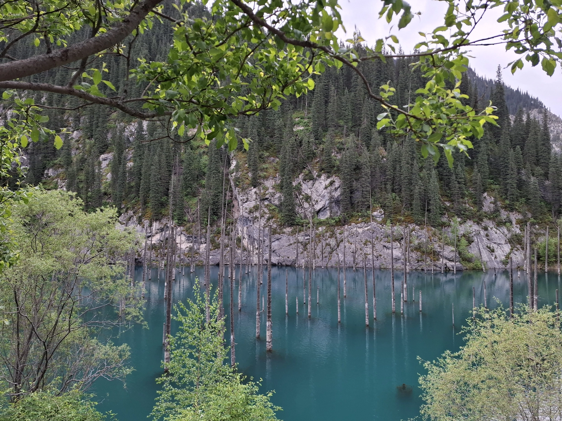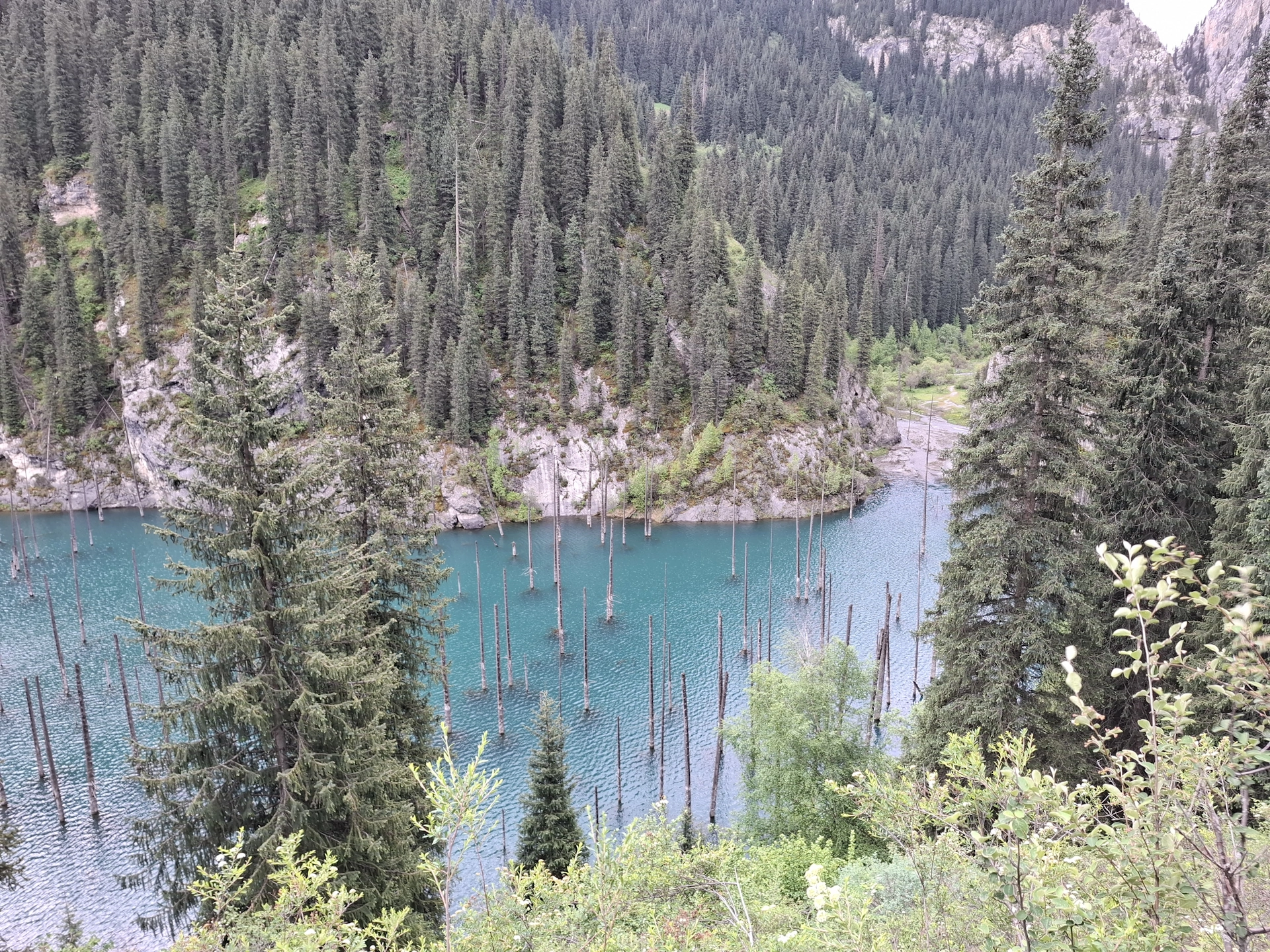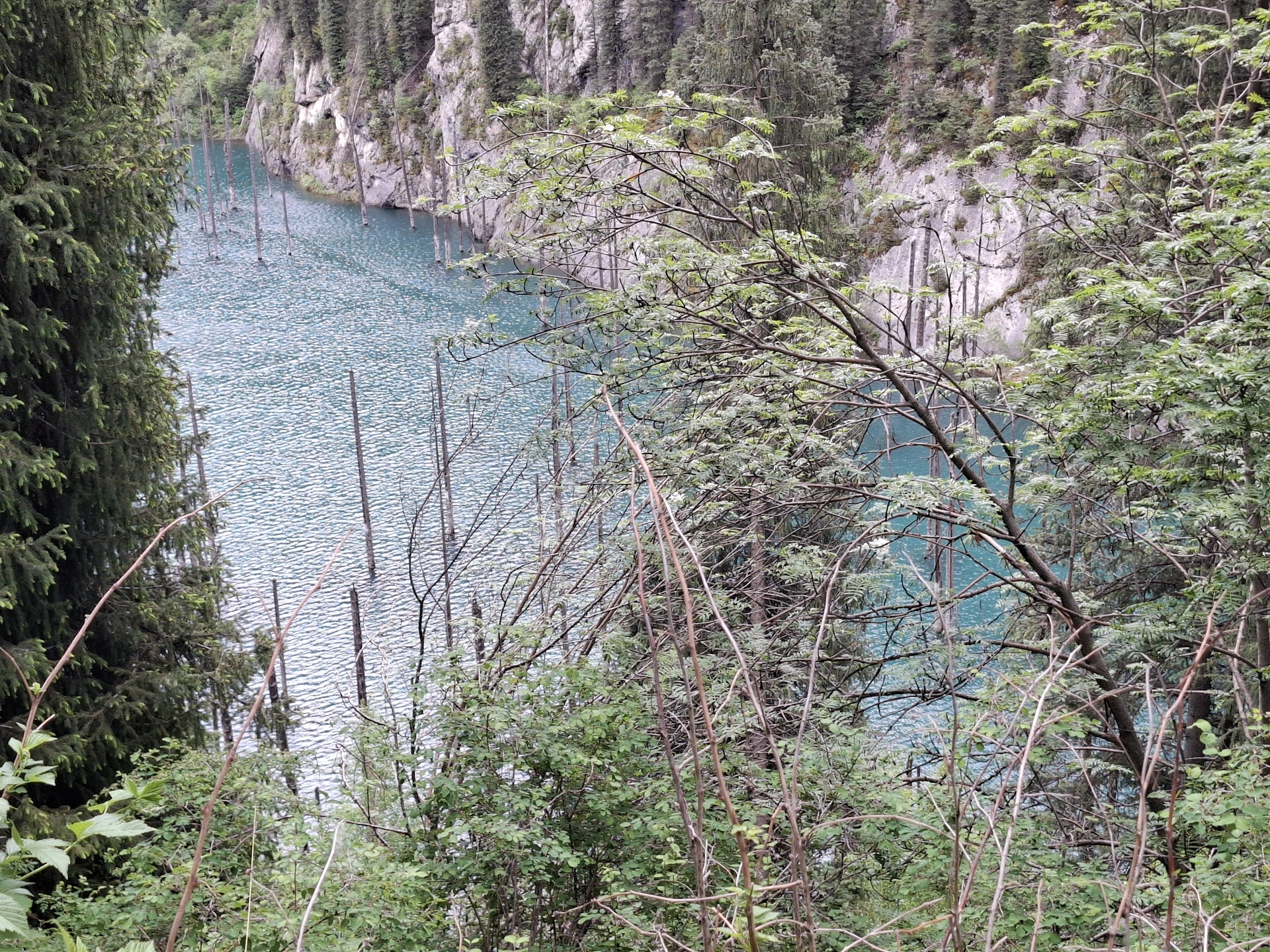 Още едно приказно красиво езеро, в прегръдката на планината Тян Шан. Това което го прави уникално, е смърчовата гора растяща в средата на езерото. Преди малко повече от век, в 1911 г., мощно земетресение разтърсва снагата на планината, предизвиквайки огромно, скално свлачище. Срутилите се скали преграждат пътя на спускащата се от планината река, образувайки естествен язовир с размери 400 на 150 м. и дълбочина до 40 м. Така растящите покрай корито на реката смърчове, се оказват в капан, в средата на новосъздаденото езеро. С годините, зелените корони на потопената гора изчезват, оставяйки голи стволове, които подобно мачтите на потънали кораби, стърчат от водите на езерото.