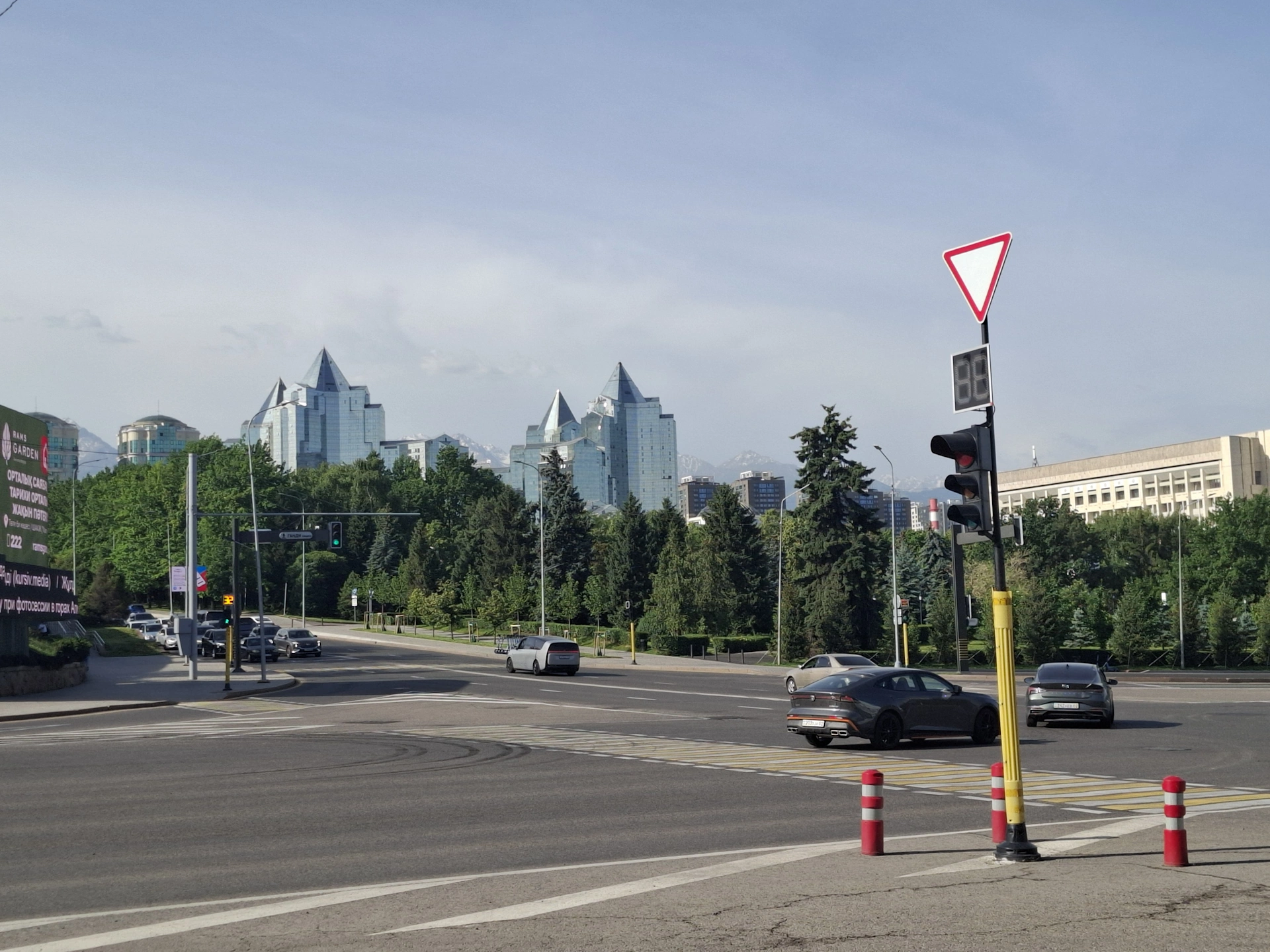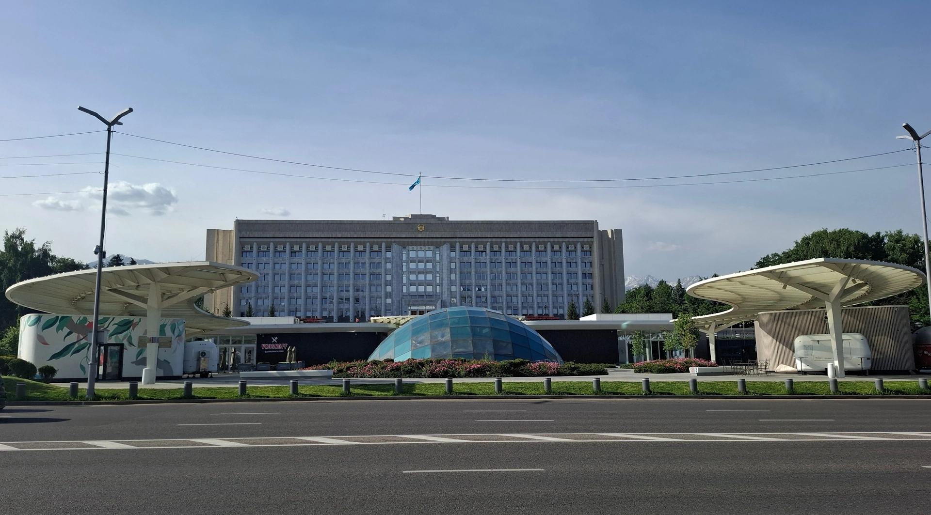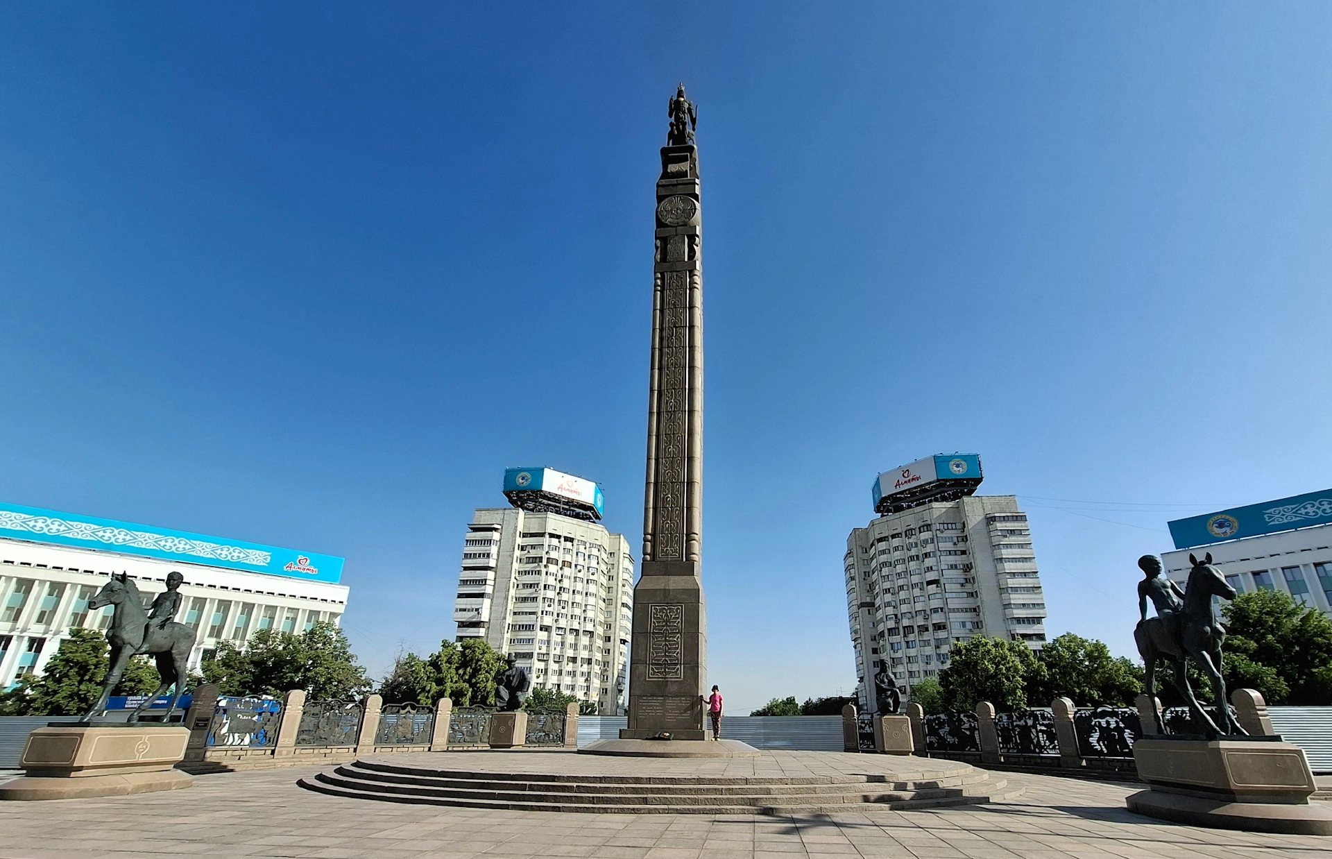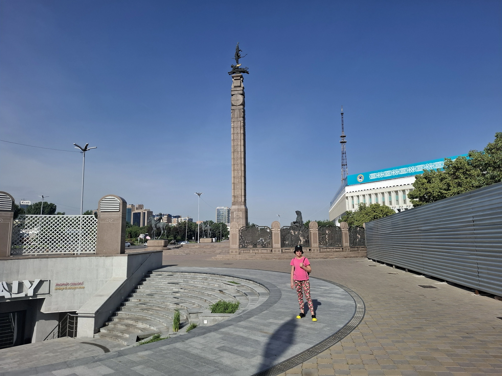 От другата страна на булеварда, точно срещу монумента на независимостта, се намира сградата на Акимата /кметството/ на Алмати.