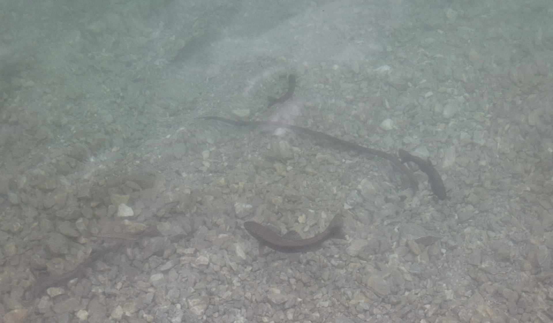 Взирайки се във водата, видях очертанията на плавно движещи се риби. Знаех, че езерото се обитава от дъгови пъстърви. Но, честно казано, не очаквах да видя такова изобилие от спокойно плаващи, до самия бряг, едри екземпляри.