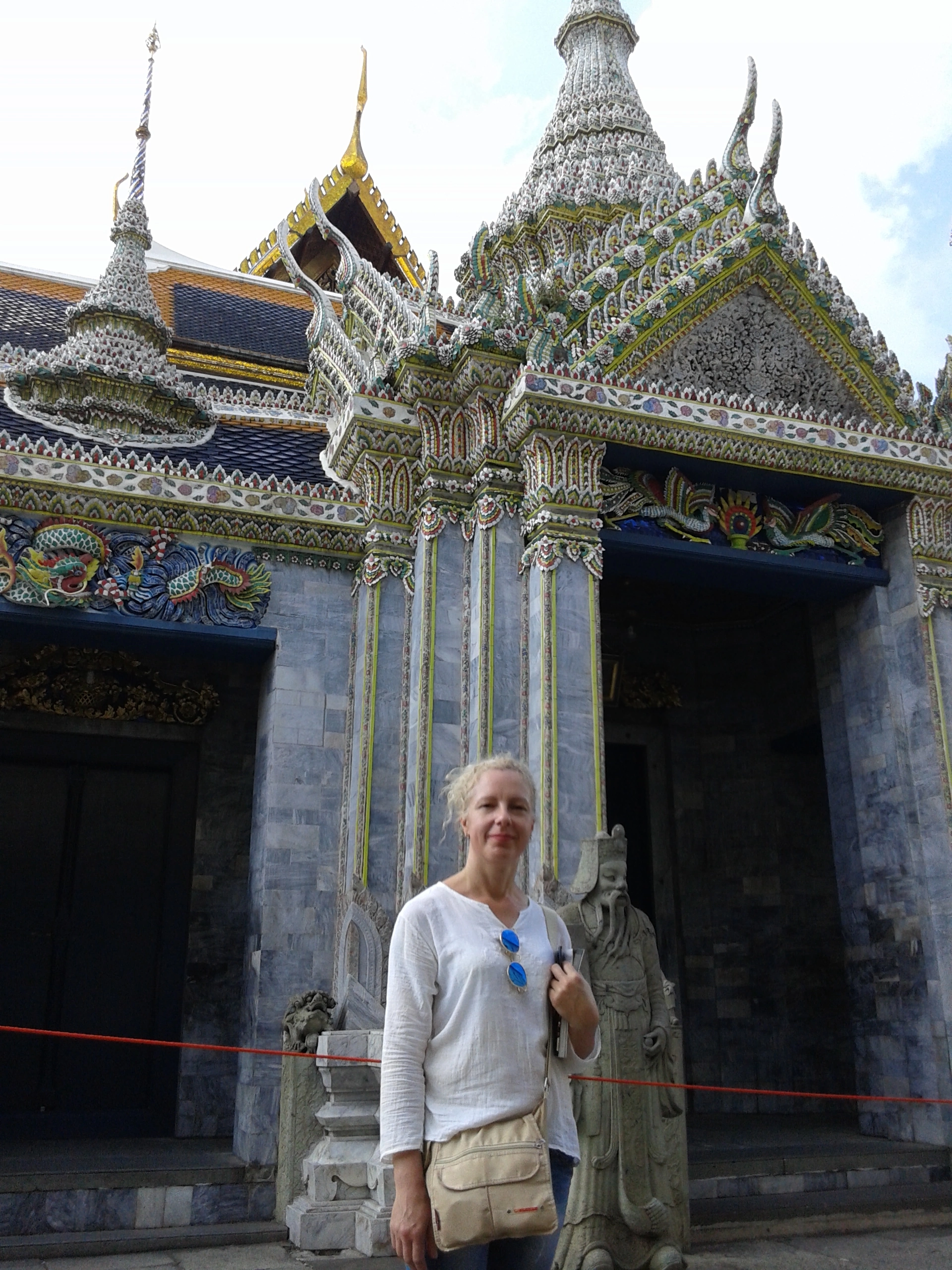 Пред портите на двореца, пристигнахме твърде рано. Наложи се, да изчакаме часа на отваряне. После, се оказа, че сме уцелели някакъв национален празник. Заточиха се дълги колони от официално облечени, строго в черно, местни посетители. След тях, под сторой, се движиха клас след клас ученици. А клетите туристи като нас, бяха отбити настрани, докато влезе цялата тази процесия. Накрая дойде и нашият ред, да влезем в забележителност №1 на Банкок, която всеки уважаващ себе си турист, посещава при идването си тук. Честно казано, след толкова много чакане, ентусиазмът ми, се беше поохладил.