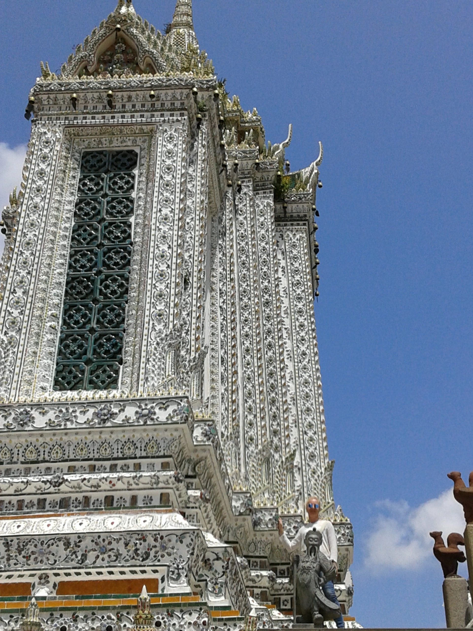 „Храмът на зората“, кръстен на хиндуисткия бог Аруна. Богът на зората и на всичко добро и светло. Първото, което привлече погледа ми, бе извисяващата се вертикално нагоре централна пагода на храма. За жалост, по време на престоя ни в Банкок, тя беше в процес на реставрация.