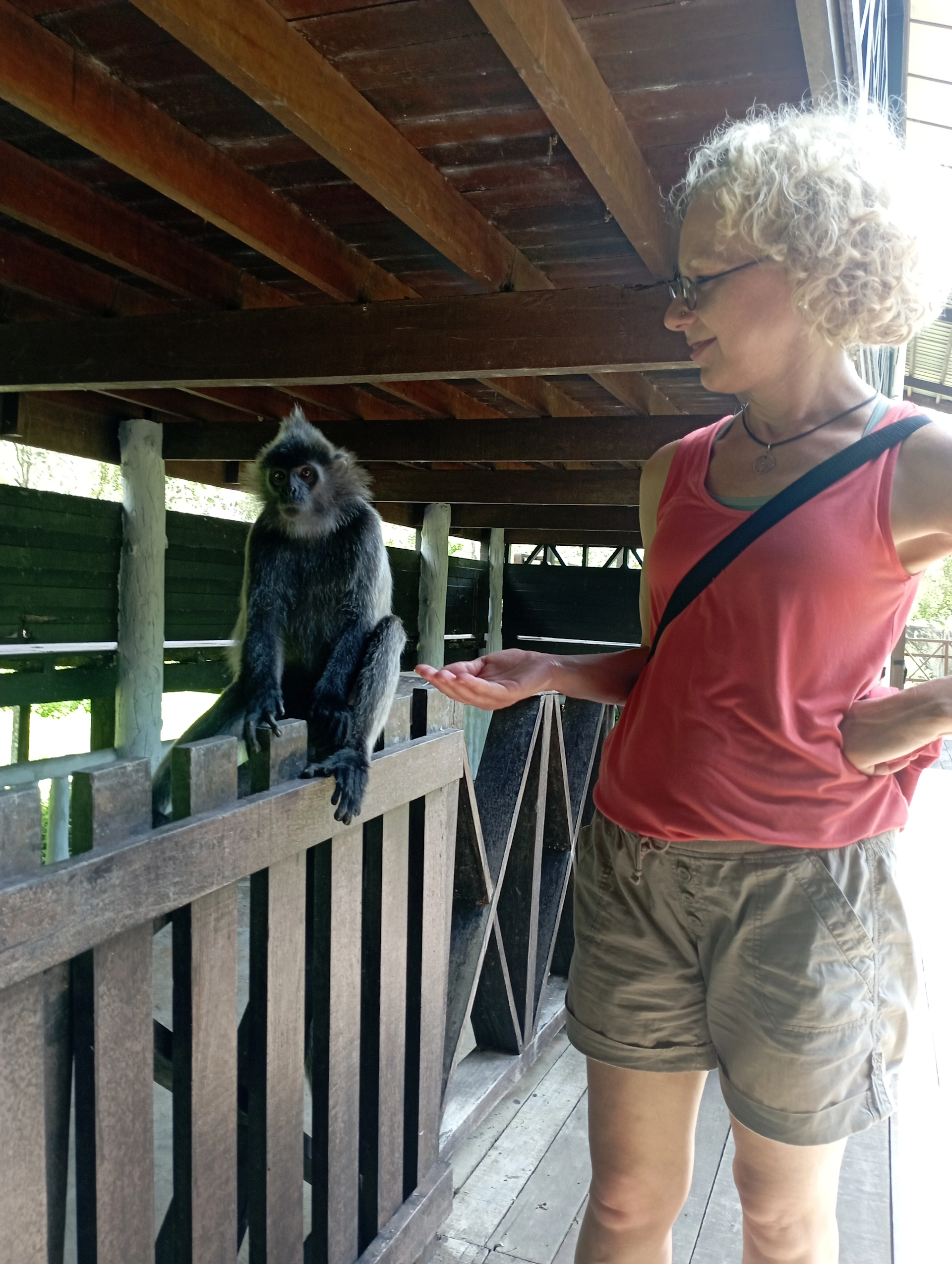 Беше страхотна гледка. Тъй като много човешки болести засягат и орангутаните, посетителите са помолени да не ги приближават, ако те дойдат до площадките за наблюдение. Полюбувахме им се и тръгнахме да се разхождаме наоколло. Както си вървяхме по дървения мост в парка, видяхме в далечината да се задава, бавно, бавно, един голям екземпляр. Аз бях като вцепенена, гледах и не помръдвах, докато той се приближаваше, подмина и без да ни обръща внимание, продължи по пътя си. Такава близка среща ни се случи два пъти този ден и бяхме много доволни от късмета си😊.