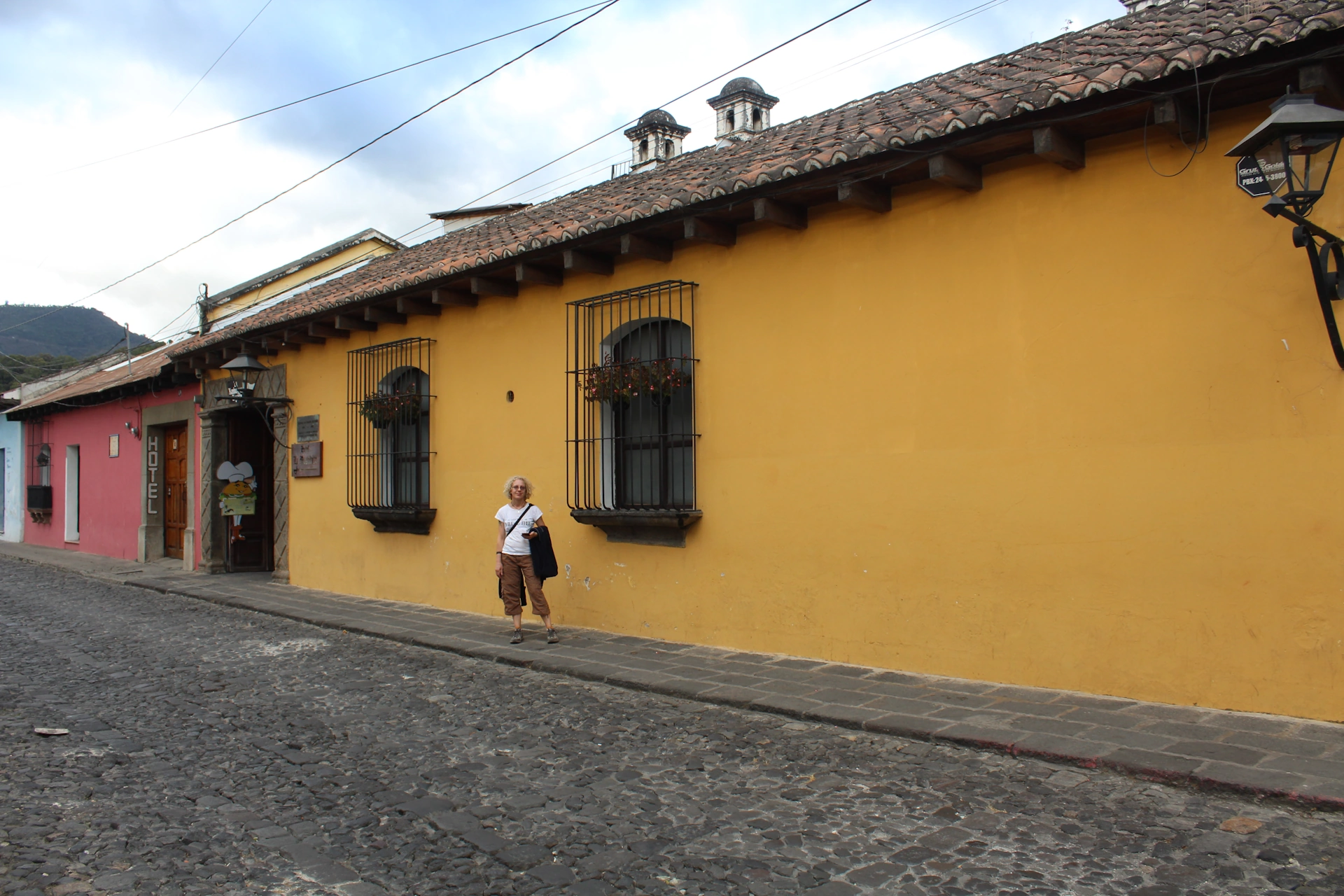 Рано сутринта, бяхме на изхода на остров Флорес, в очакване на транспорта ни за Антигуа. Той се оказа малко, раздрънкано бусче, с тесни и неудобни седалки. С него трябваше да изминем близо 500 км. до старата столица на Гватемала. Тази не лека задача ни отне почти 12 часа, като на места успявахме да развием шеметната скорост от 60 км. в час😊 Пътищата в Гватемала са много зле, с изключение на тези около и в големите населени места. Точно преди да влезем в Гватемала сити, шофьорът спря за почивка. Слязохме и тръгнахме към намиращия се на отсрещния тротоар хранителен магазин. Изненадата ни беше голяма, когато вратата ни отвори въоръжен с пушка помпа мъж. Огледа ни, ние него също и ни пусна да влезем. Едва вътре в магазина, наблюдавайки стоящия на вратата охранител осъзнах, че от преценката му, е зависело, дали да ни пусне вътре, или да насочи пушката си срещу нас. В този момент, ясно усетих истинските измерения на опасността в Гватемала. Купихме си вода, нещо за хапване и се върнахме обратно в буса. В Антигуа пристигнахме по тъмно. Половинката ми е спец в ориентацията, и бързо откри предварително резервираната от нас къща за гости. Тя се намираше на края на града. От другата страна улицата имаше бяла бетонна стена. Наоколо беше безлюдно и тъмно. Почукахме на огромната дървена врата, но никой не ни отвори. Поседяхме, поогледахме се. Аз малко се притесних, и изнервена предложих да търсим друго място за настаняване. Тук, явно бяхме ударили на камък. Половинката ме убеди да изчакаме. Недалеч от нас спря черна кола, с тъмни стъкла. От нея слязоха двама мъже и се насочиха към нас. Аз още повече се спекох. Успокоих се едва когато разбрах, че това са собствениците. Отвориха вратата и пред нас се разкри красива гледка – малко декорирано дворче, заобиколено от жилищно пространство. Показаха ни стаята, беше много уютна, заведоха ни до кухнята, оборудвана с всичко необходимо. После видяхме големия хол, с телевизор и удобен диван. Място беше страхотно и надмина очакванията ни. Оказа се, че сме единствените посетители и всичките тези удобства, бяха само наши в следващите дни. На стената в хола имаше стотици надписи от туристи, отсядали някога там. Ние също увековечихме имената си и датата на нашето пребиваване😊