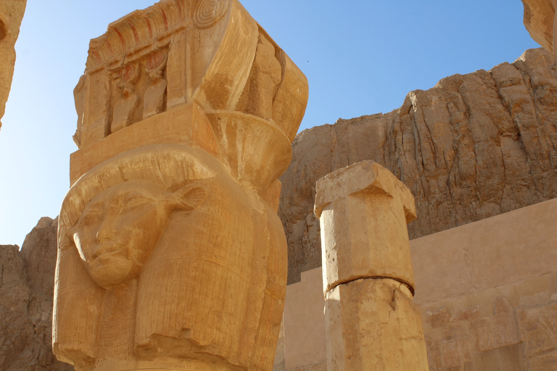 Внушителен паметник, изграден преди повече от 3 000 години от първата жена фараон, управлявала успешно Египет почти 22 години. Колосален архитектурен шедьовър, налагащ чувството за безспорното величие на неговата създателка. Състои се от три стъпаловидно разположени тераси, свързани с две дълги наклонени рампи, изградени по-начин, който е позволявал на царицата/фараон, да се изкачи до върха на храма с колесницата си. Твърди се, че някога на терасите на храма, е имало езера, заобиколени от красиви градини с екзотични растения и дървета, своеобразно предверие към вградените в скалите храмове.