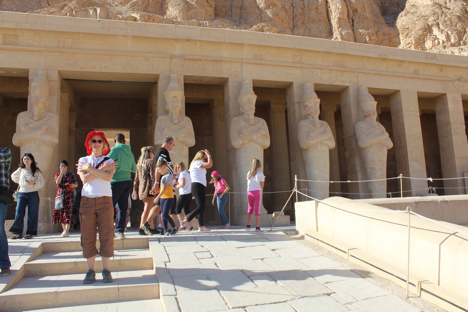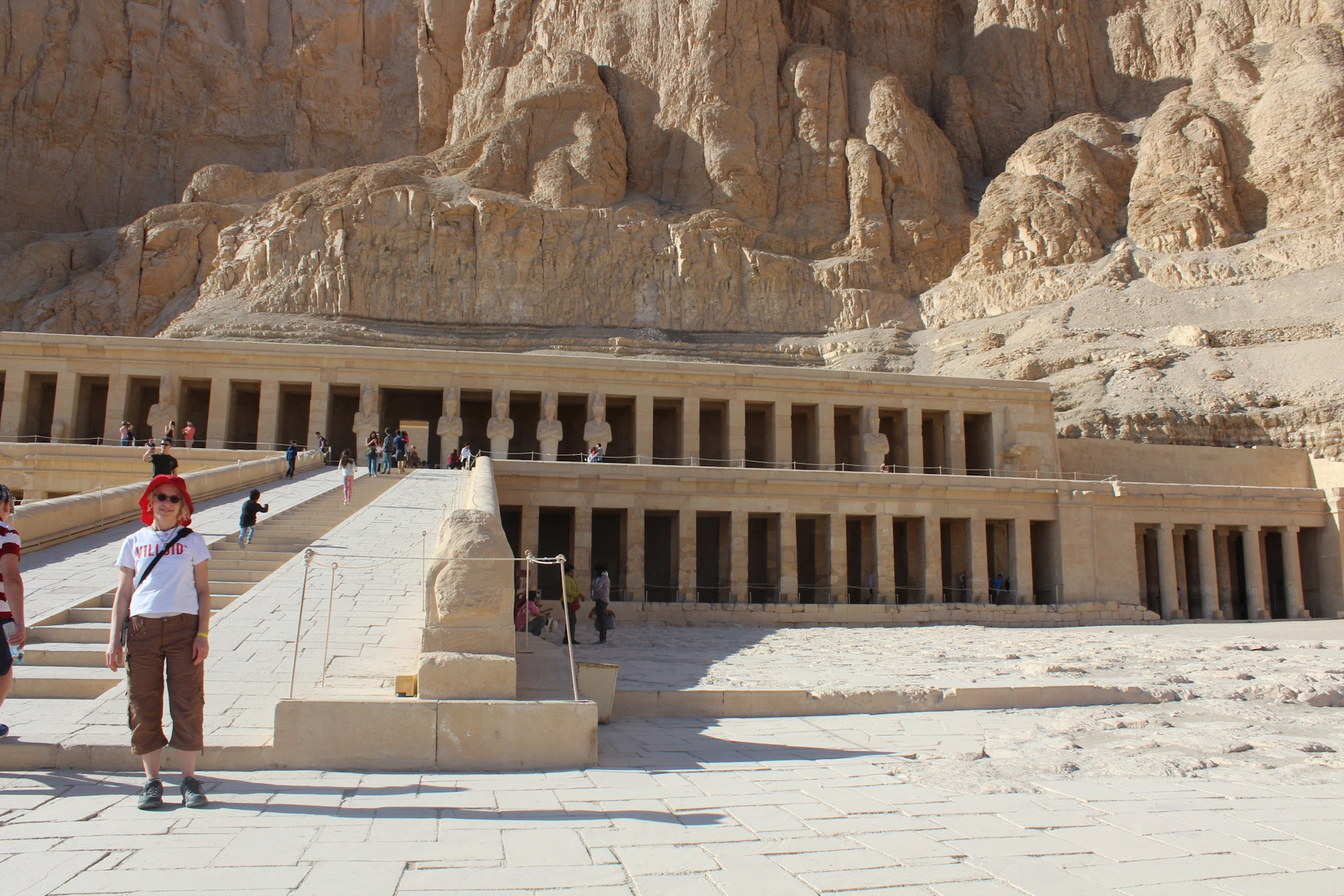 Там вече с автобус продължихме към следващата ни цел - храмът на царица Хатшепсут. Отдалечавайки се от даряващата живот Нил, сякаш попаднахме в един друг, мъртав свят – пустинен пейзаж, преминаващ в извисяващи се скали с пясъчен цвят, в подстъпите на които се мяркаха изоставени, полуразрушени сгради. На места в скалите, ясно се виждаха входовете на пещери, древни гробници по думите на гида ни.