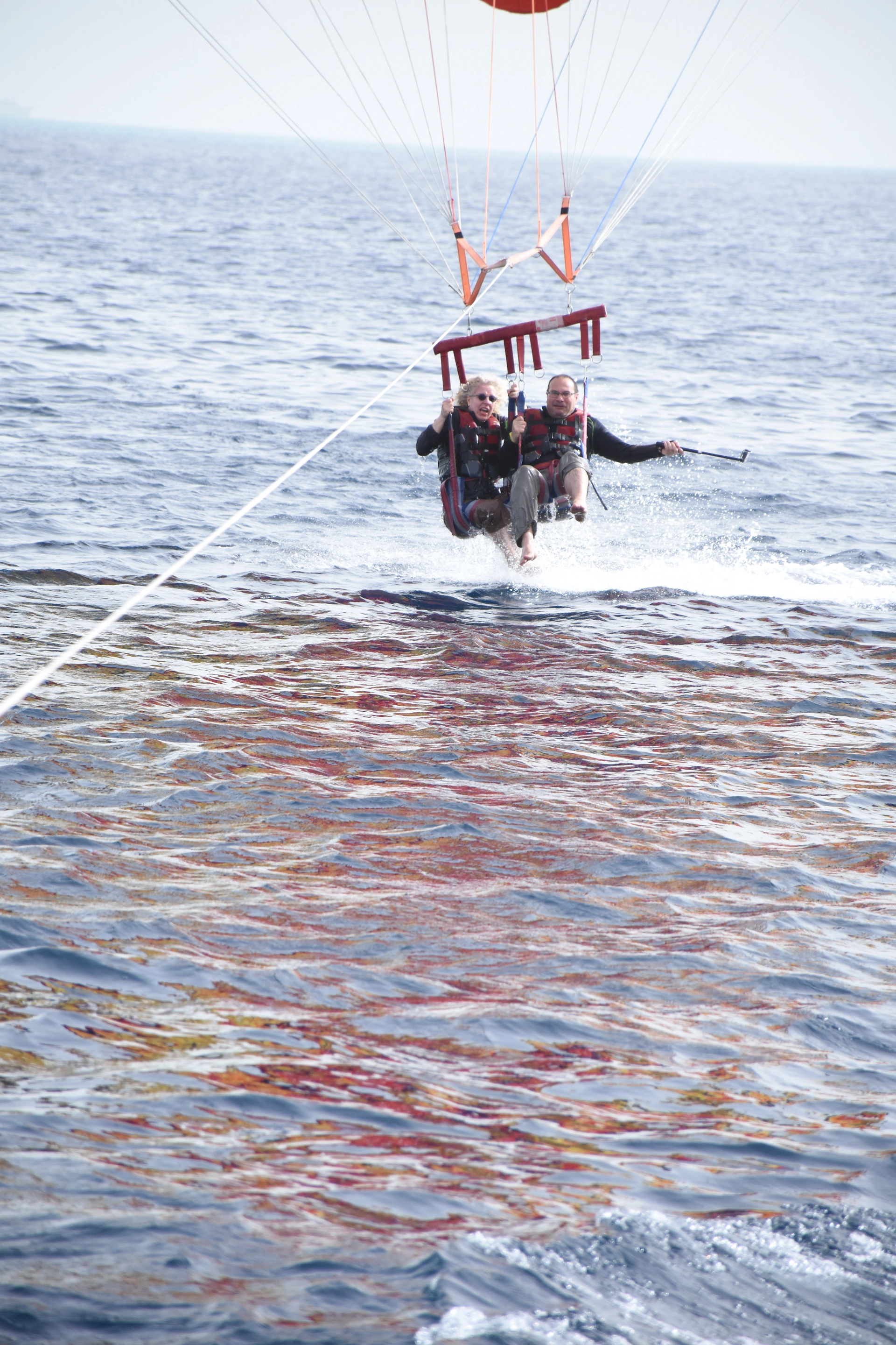 В Хургада, се прибрахме по тъмно, доволни и впечатлени от видяното този ден. Заслужаваше си. На следващия ден ни предстоеше параслейдинг – полет с парашут дърпан от катер над водите на Червено море😊 Пак ни взеха от хотела и ни закараха на брега на морето, където ни чакаше катера. Пропуснах да кажа, че за да се издигнат двама души едновременно, общото им тегло не трябваше да надвишава 150 кг. Ако надвишава, сумата скача. Ние ги заковахме точно, но стана така, понеже половинката ми се оказа с два килограма по-лек от това, което ми беше казал, а аз с два килограма по-тежка, от това което му бях казала😊 Като стъпихме на кантара, истината лъсна, ееех суета...😊 Качихме се на катера, екипираха ни с предпазни жилетки и парашут, засилиха, и двамата с другарчето се издигнахме високо в небето над морето, закрепени с въжета за катера. Реехме се като птици над водата. Атракцията продължи около половин час, през който намаляйки скороста, на няколко пъти ни потапяха във водата, а след това засилвайки, ни издигаха отново нагоре. Беше силно, покачващо адреналина изживяване. Накрая, забавяки, бавно ни издърпаха обратно на борда.