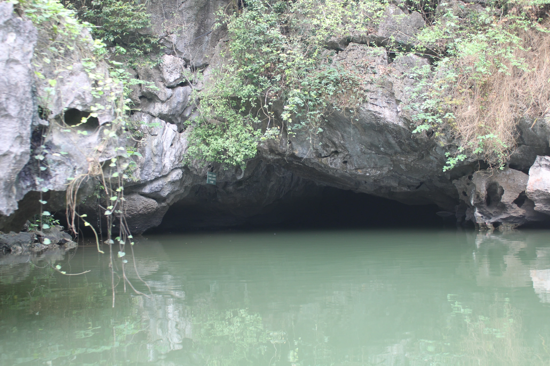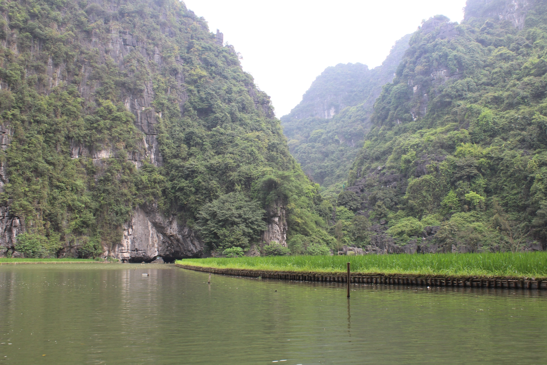 Пейзажите наоколо бяха подобни на залива Ха Лонг – неспирна върволица от варовикови скали. Разликата тук беше, че вместо да бъдат разположени в Южнокитайско море, тези грандиозни, скални цветя, бяха разхвърляни по земята и опасани с речни канали. Изведнъж забелязох, че реката се губи в основата на вертикалната скала пред нас. Вгледах се и видях, като че ли до самата вода процеп. В първия момент ми се видя невъзможно да минем от там, но лодкарят ни не смяташе да се отклонява, и гребеше право към уголемяващия се с приближаването ни проход.