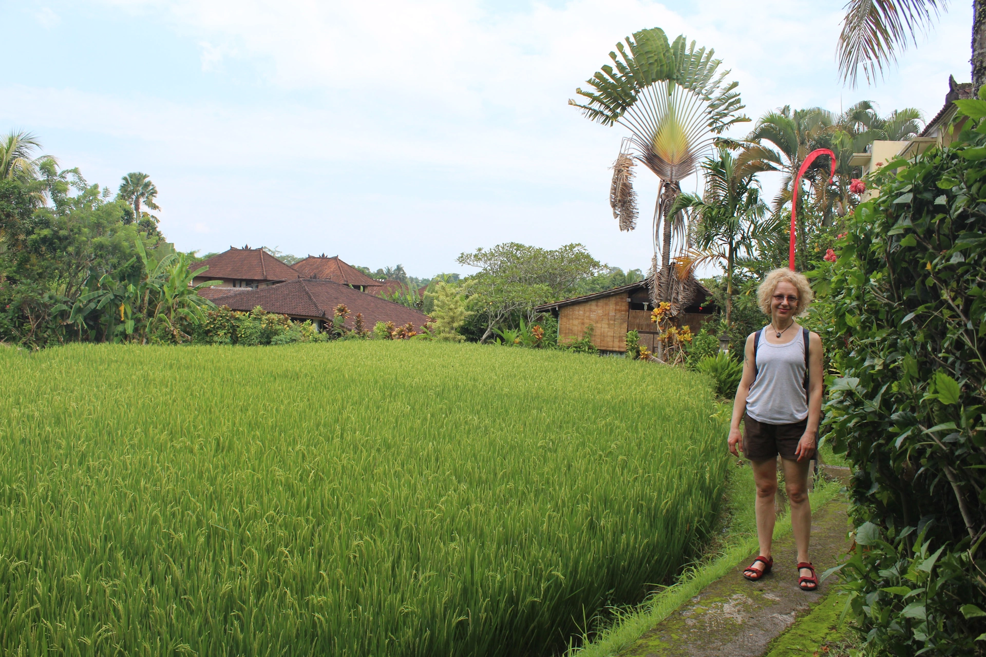В един момент, вървяхме по тясна пътека, провирайки се между оградите на добре изглеждащи вили и заобикалящата ги буйна растителност, а в следващия, изведнъж попаднахме в малки оризови полета, които постепенно ставаха все по-големи и по-големи.